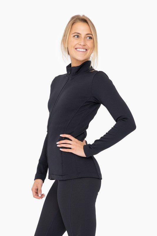 jacket features a high neck, 4-way stretch fabric, a full front zip,