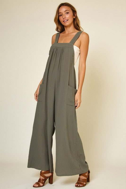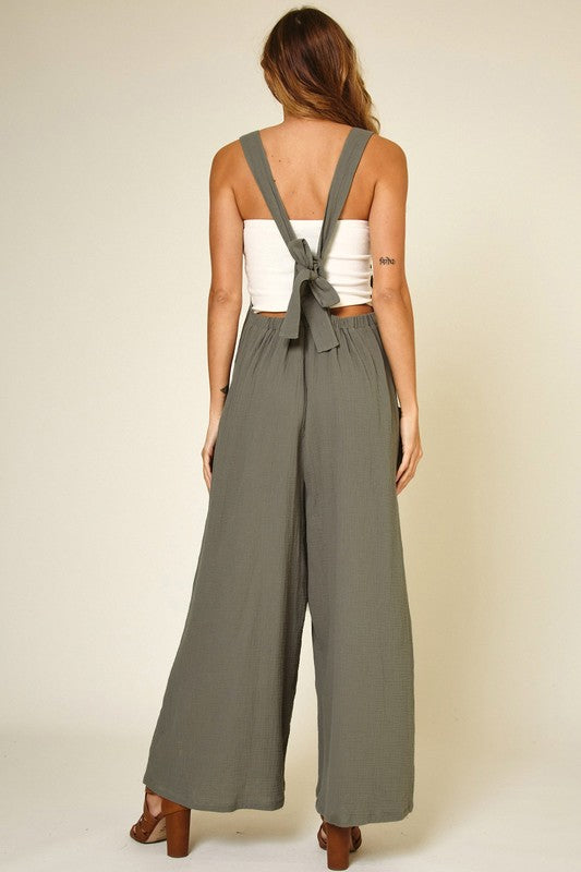 Cotton gauze solid fabric -Strap shoulder and self tie back -Straight neck -Front out pockets -Open back with elastic waist