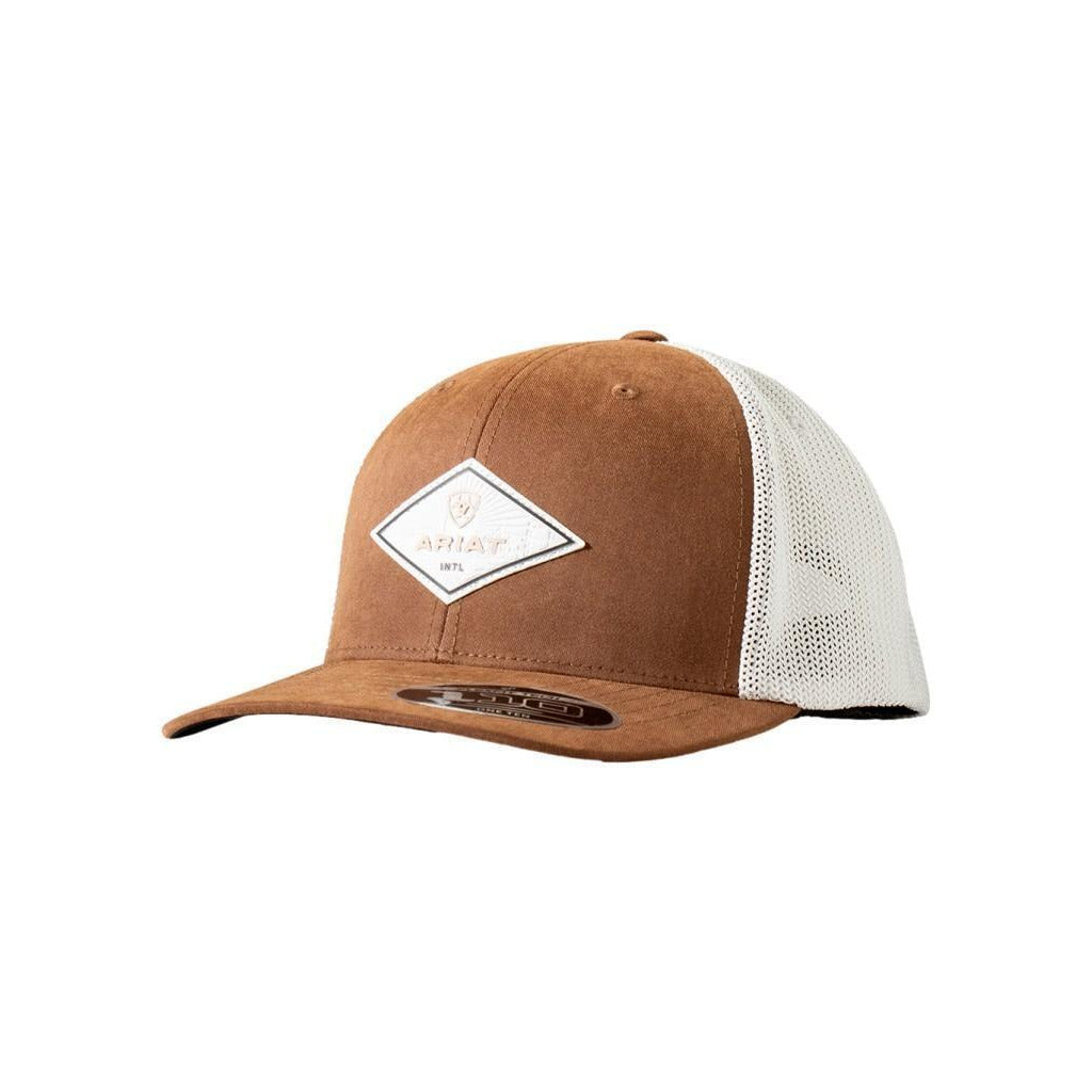 Mens Ariat Hat: Mens Ariat Western Hat. Ariat men's cap by M&F Western Products, This 6 panel structured baseball hat has brown front panels and bill with a diamond shaped faux leather patch with an embossed desert scene and a rubber Ariat logo and shield. It has a cream colored mesh back and brown fabric snap back closure for that perfect fit. 92% Polyester, 5% Nylon, 3% PU.