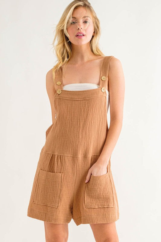 Adjustable Button Detailed Gauze Sleeveless Romper -Adjustable button detail -Front flap pockets -Square neckline -Elastic waist -Open back detail -Deep armhole
