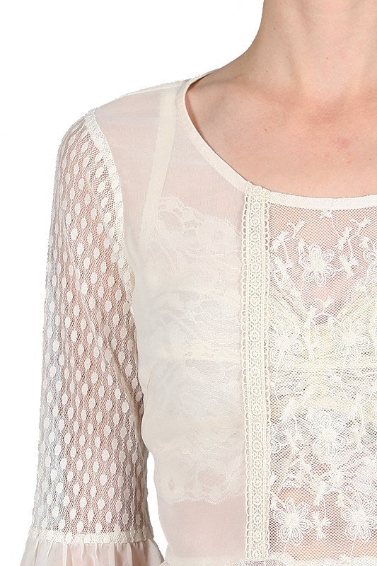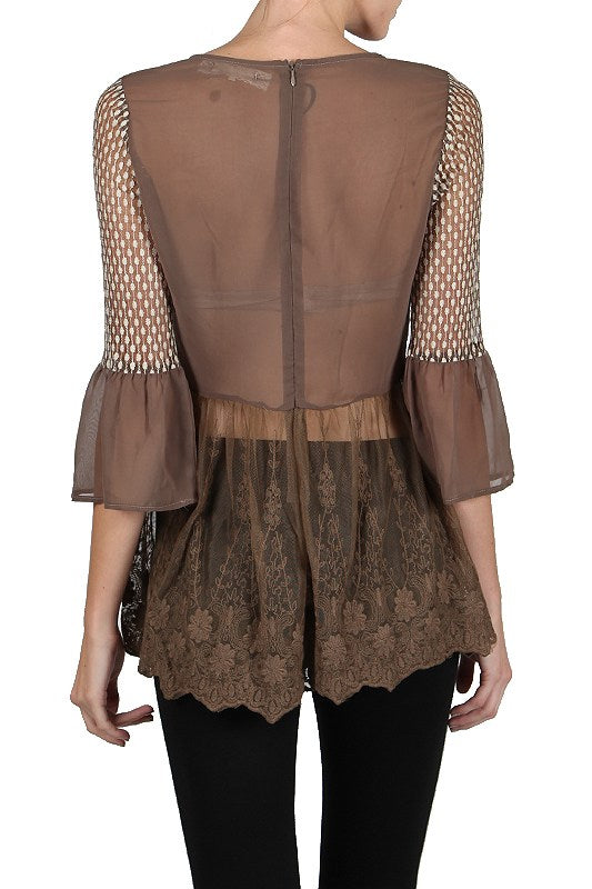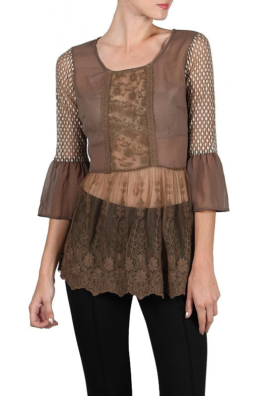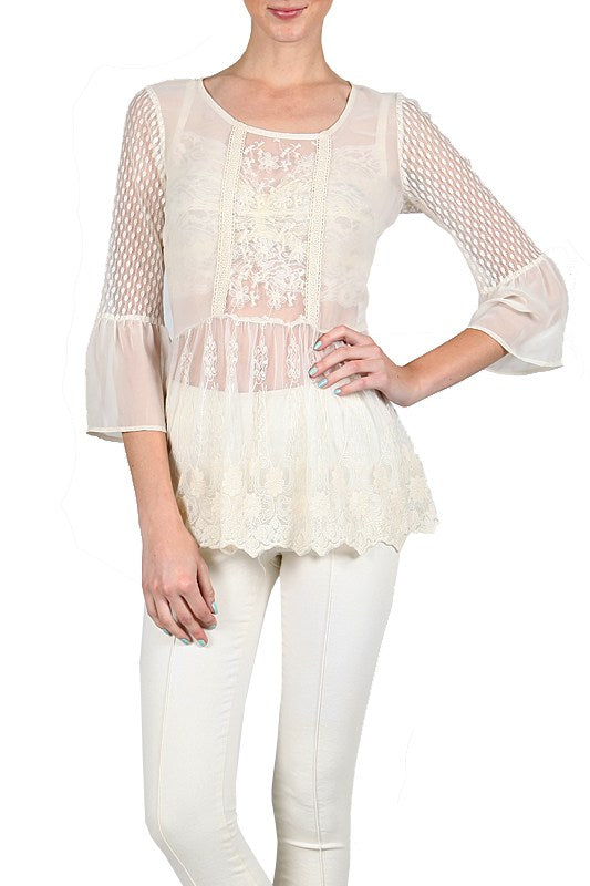 Embroidered lace tunic top available in two colors cream or brown.