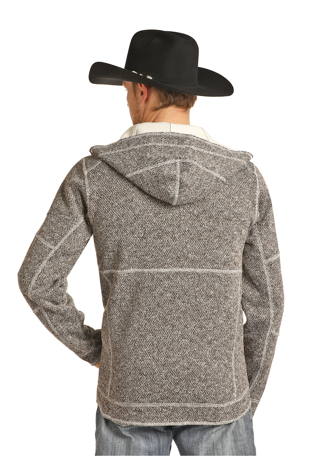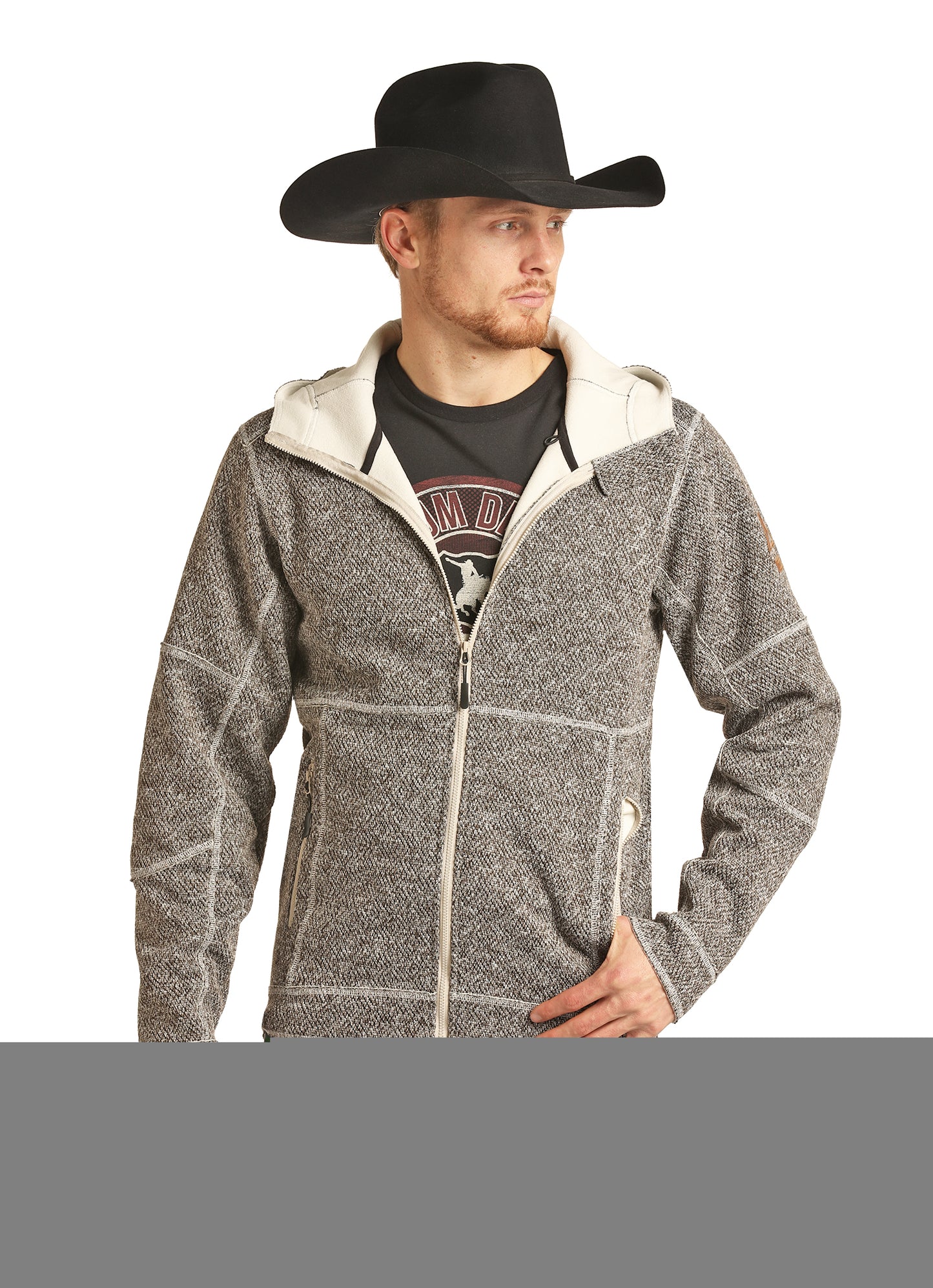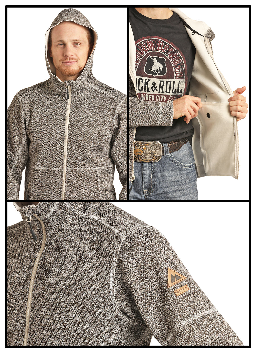 Men’s longsleeve full zip jacket with a sweater melange knit. This jacket is bonded with natural fleece, has front zipper welt pockets, double leather logo label on the Left sleeve & a hood.