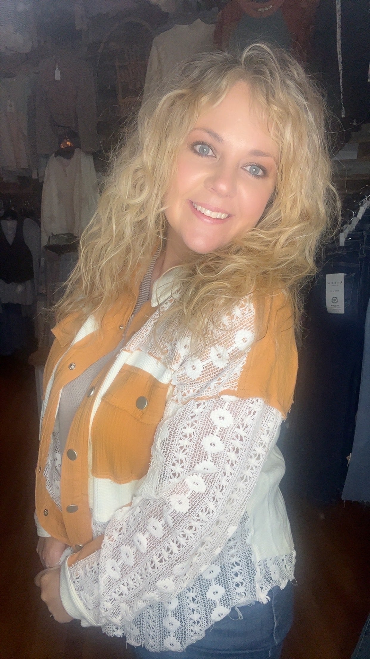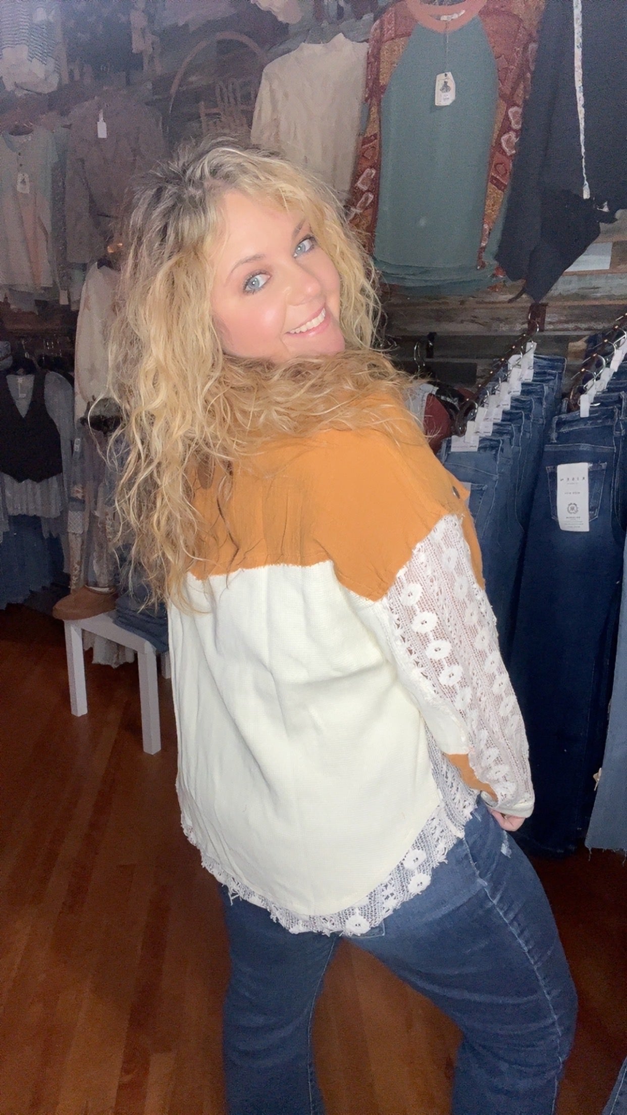 Ivory/Ochre mix and matched button down shirt.