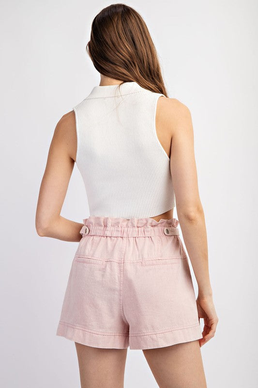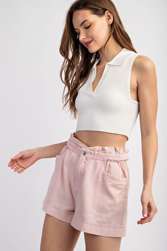 elastic waist with ruffle detailing, two open front pockets, two faux