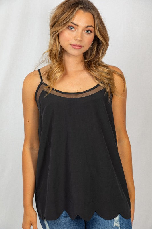 Sleeveless solid woven top with a round neck and it has a beautiful sheer insert detail, scalloped bottom hem and adjustable straps