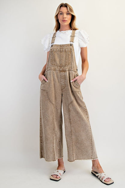FLORAL PATTERN WASHED TWILL OVERALLS -WIDE LEG SILHOUETTE -FRONT AND BACK POCKETS -CHEST KANGAROO POCKET -SIDE BUTTON CLOSURE -ADJUSTABLE BRACE STRAPS -RELAXED AND LOOSE FIT -SMALL MEASUREMENTS : INSEAM - 36" OUTSEAM - 24.25" & BUST - 17"