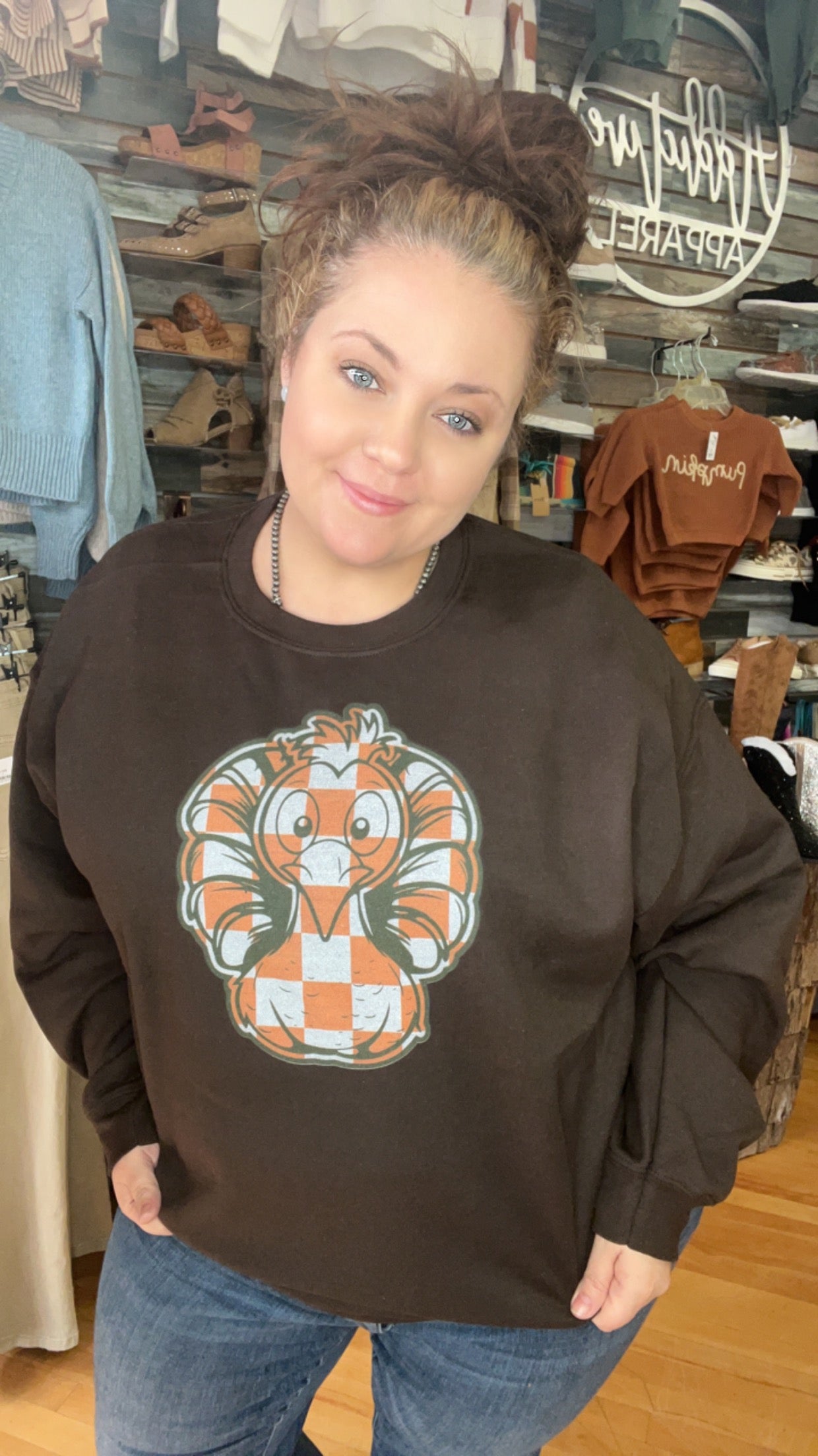 Crew neck sweatshirt in chocolate brown with a cute checkered turkey graphic