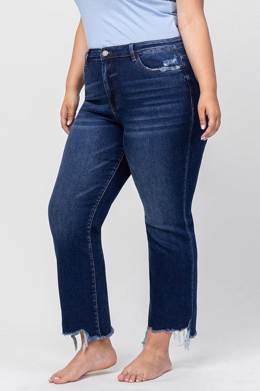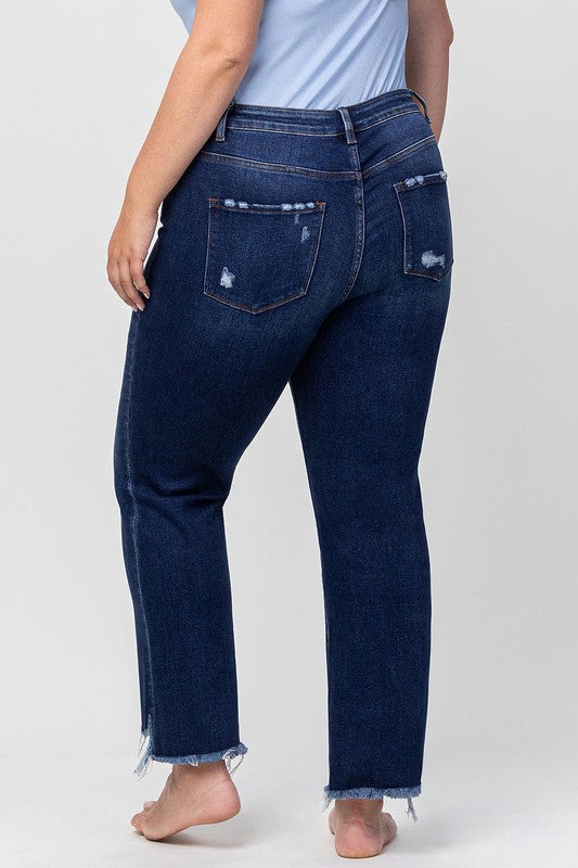 COMFORT STRETCH DENIM, HIGH RISE WAIST, DISTRESSED DETAIL, UNEVEN