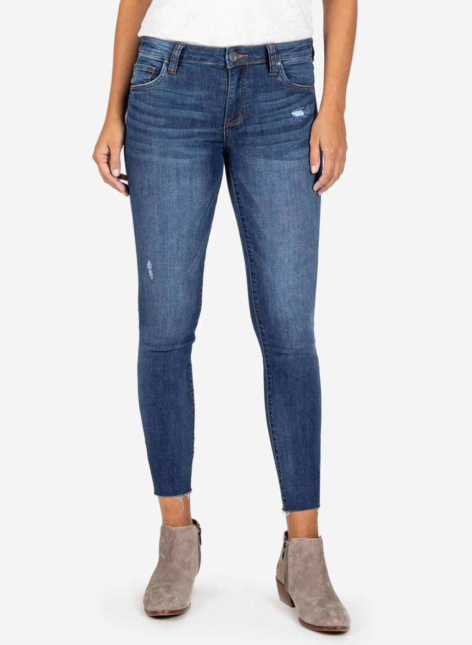 Kut from the Kloth Connie ankle Skinny Jeans. This skinny jean has a classic silhouette that will never go out of style. Expression wash denim is a cotton blend with a touch of stretch, the dark stone base wash with light fading and whiskering.