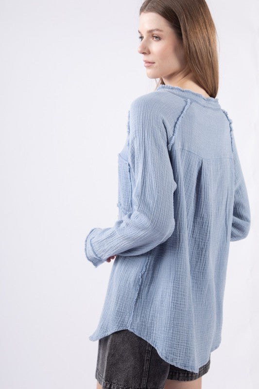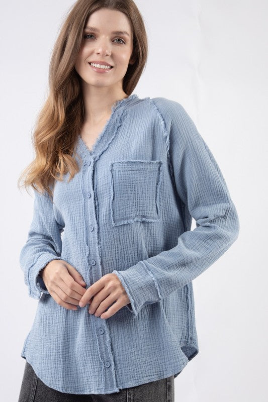 Oversized Washed Woven Crinkled Gauze Shirt Top - Stand Collar - Button Up - Raglan Long Sleeve - Patch Pocket - Oversized Shirt - Oversized Woven Shirts - Oversized Pocket Shirts - Woven Shirts - Laid Back Casual Shirts - Transitional Shirts - Casual Woven Shirts With Pocket
