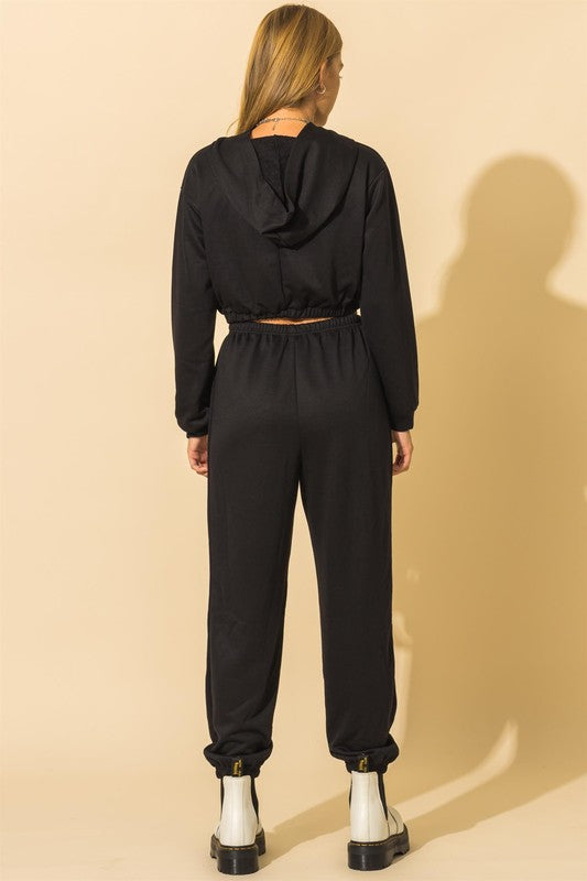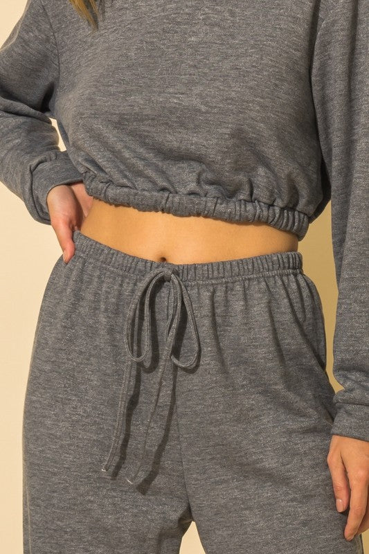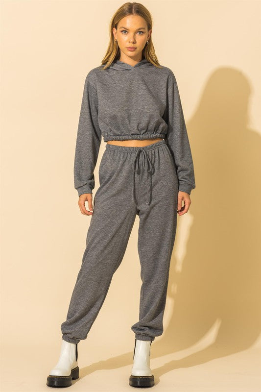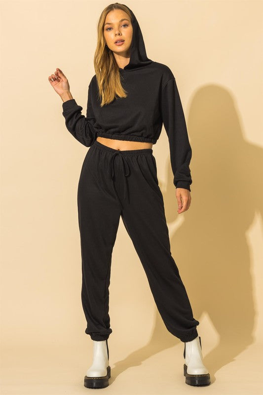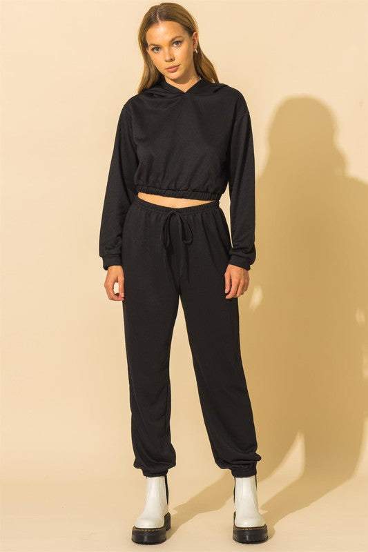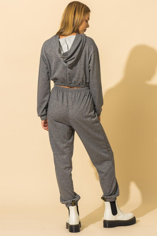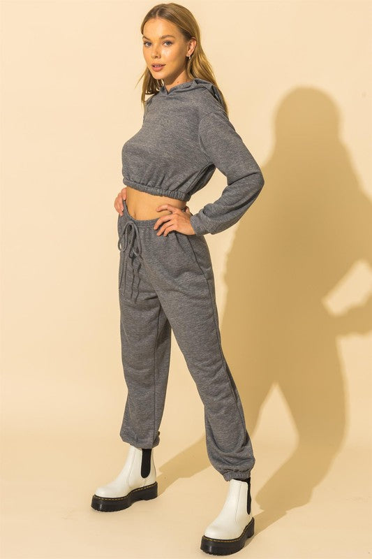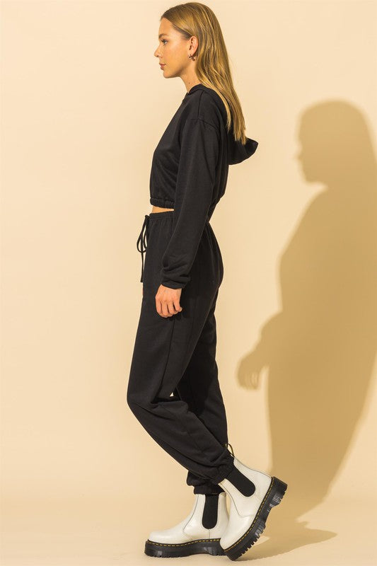 Find yourself with the same Vibe cropped sweatshirt matching set. Sweatshirt has a hood and long sleeve with a cropped elasticized hem. The set includes joggers with high rise fit and drawstring waist.