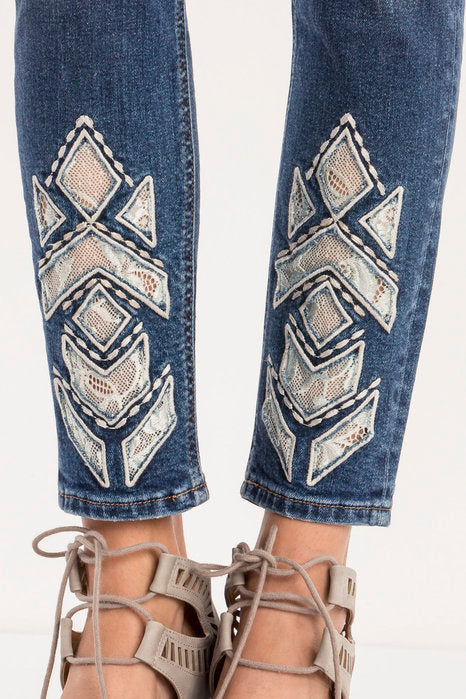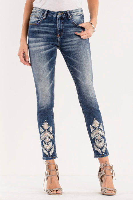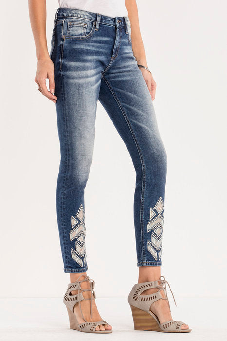 If you’re down to stand out these ankle skinny jeans are for you! Details include eye-catching design at front, mid-rise waist, contrast stitching, 5-pocket design, distressing on back pockets, fading, whiskering, and minimal hardware.