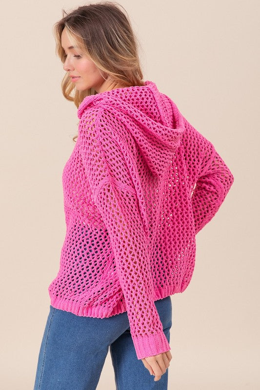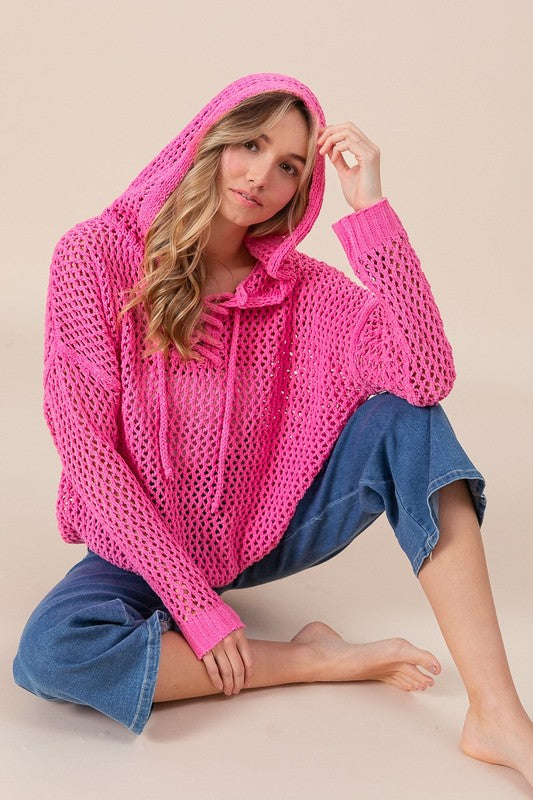 CROCHET KNIT FRONT CROSS STRAP HOODIE TOP