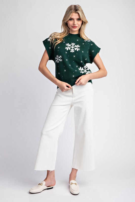 Snowflake printed short sleeve sweater top featuring a mock neckline,