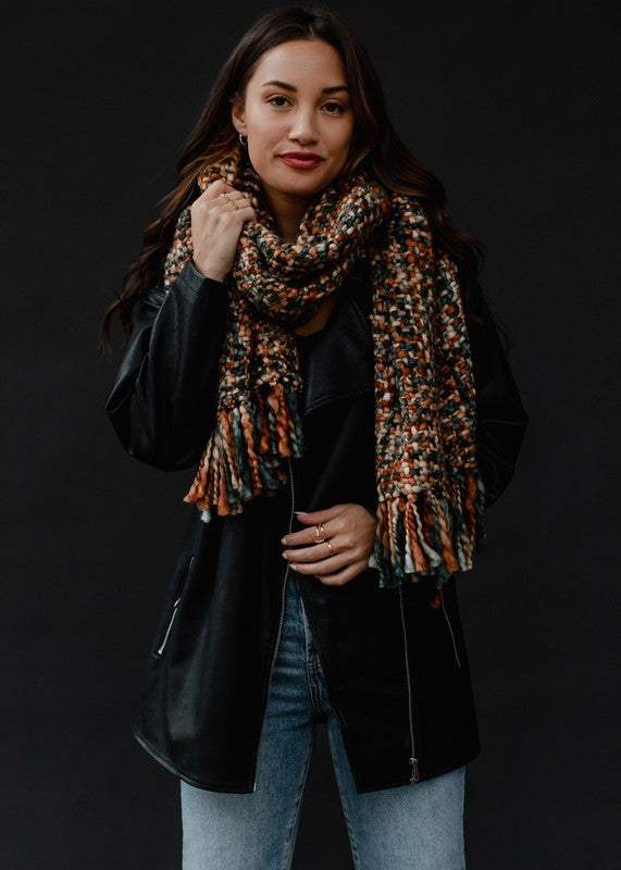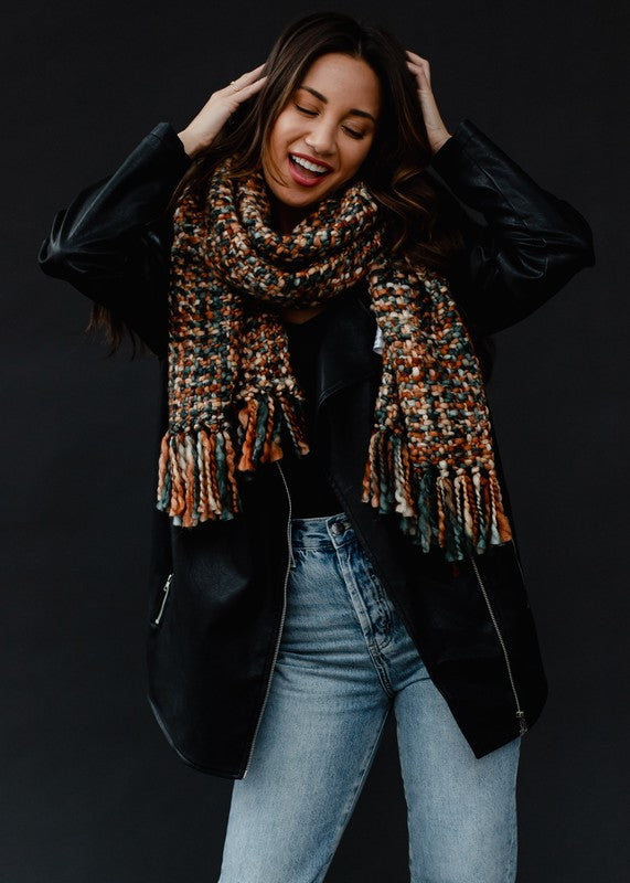 Dark green/rust loom woven long scarf with fringe 100% Acrylic 16" x 72"