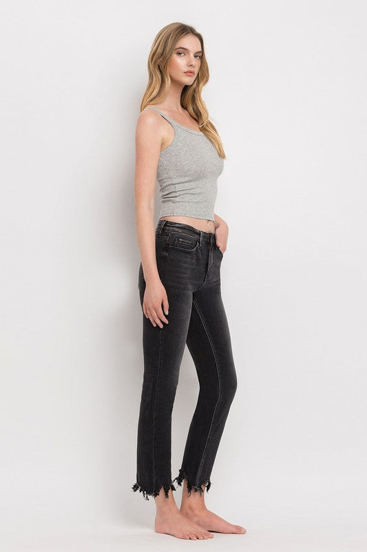 Vervet Black HIGH RISE SLIM STRAIGHT JEANS COMFORT STRETCH DENIM, HIGH RISE WAIST, FRAYED UNEVEN HEM DETAIL, CROPPED LENGTH, SLIM FIT, STRAIGHT LEG JEANS F. RISE: 10 1/4" / INSEAM: 27" / LEG OPENING: 13" MODEL IS 5'10" WEARING SIZE 26