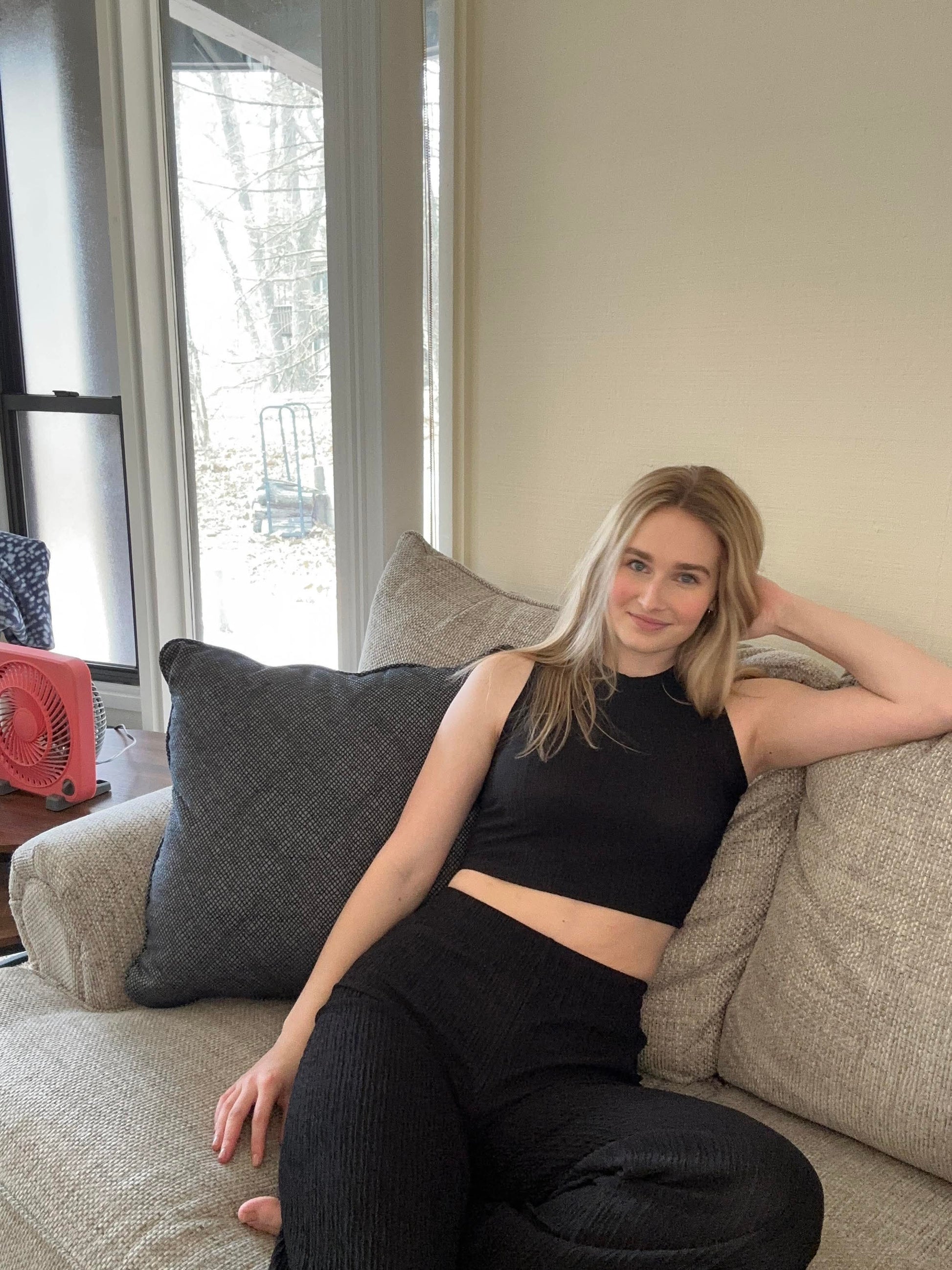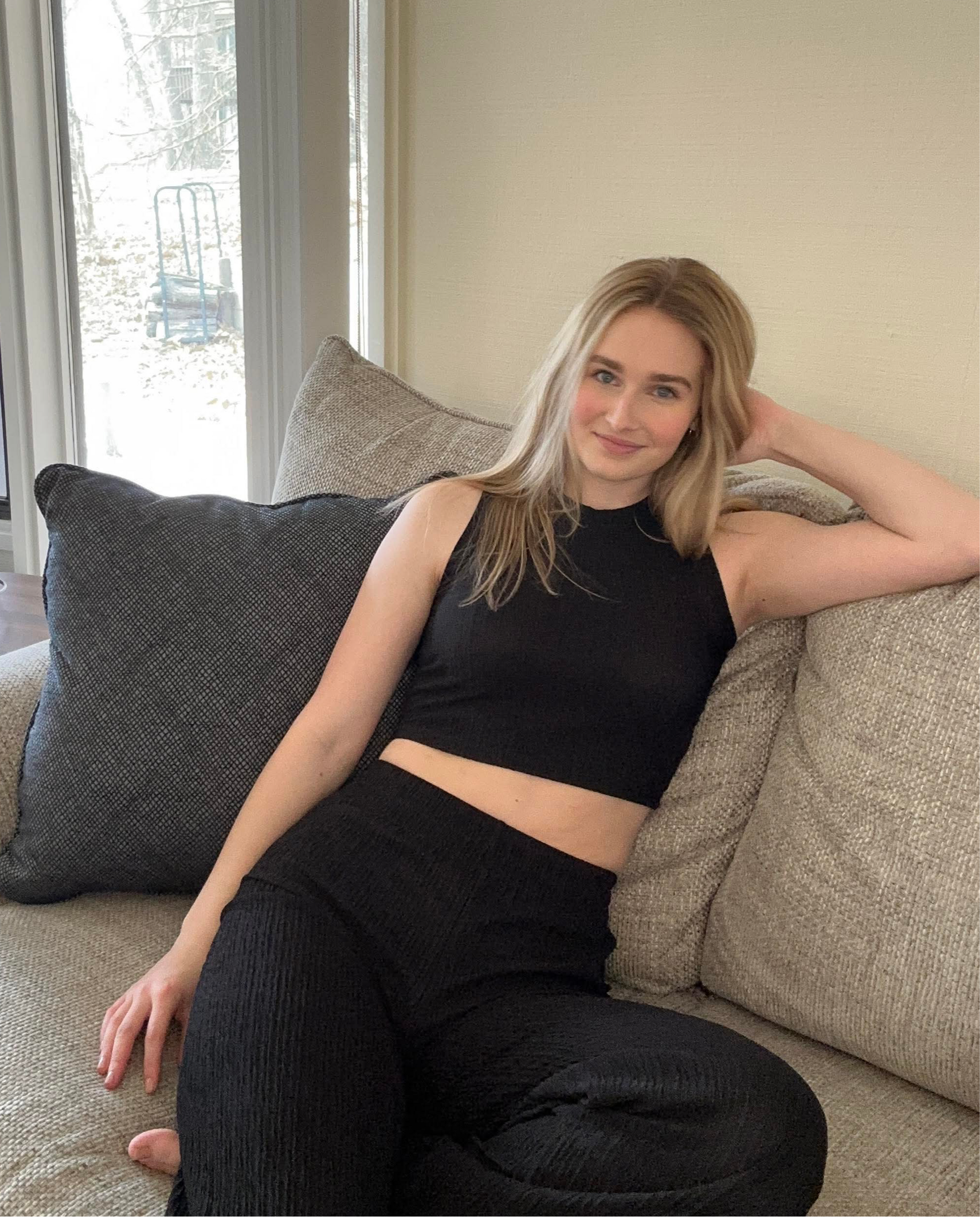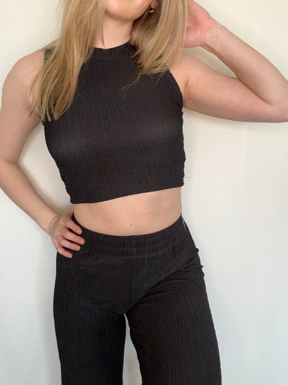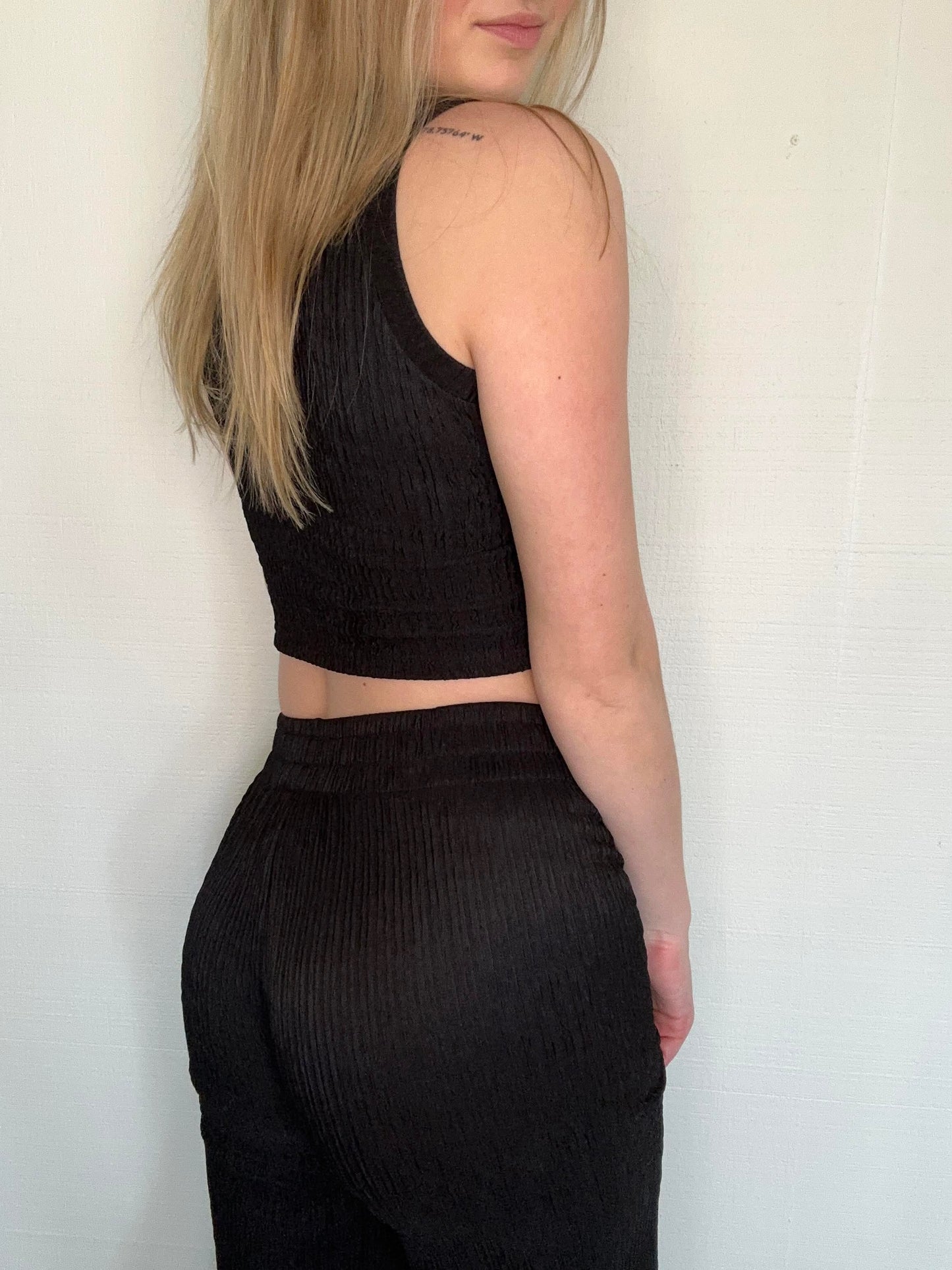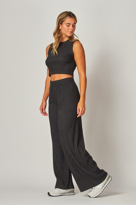 Crinkle Textured fabric -Sleeveless crop tank top -Elastic waistband pull on wide leg pants *Model is wearing a size medium*