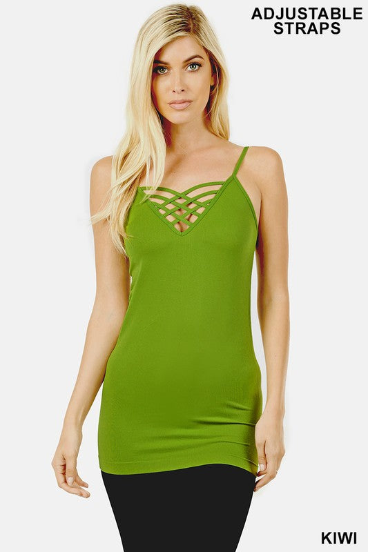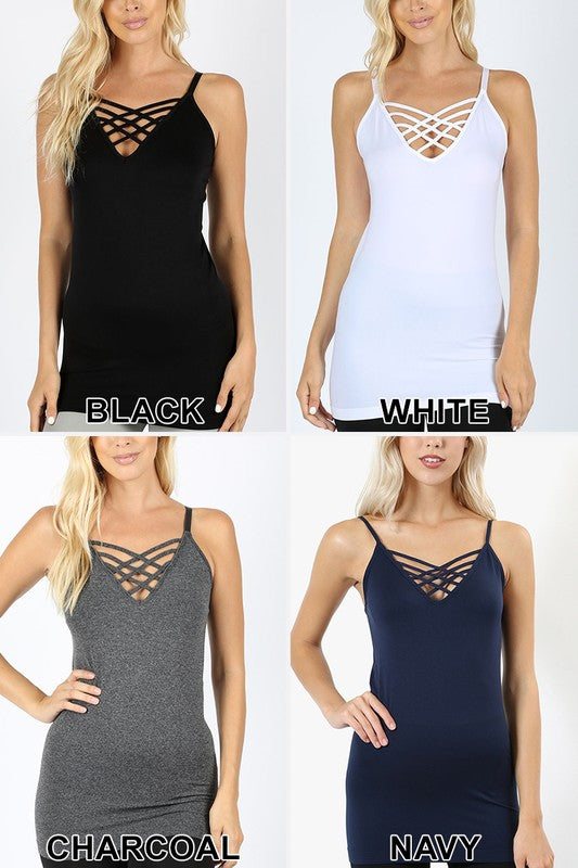 straps. Vneck tank with lattice design