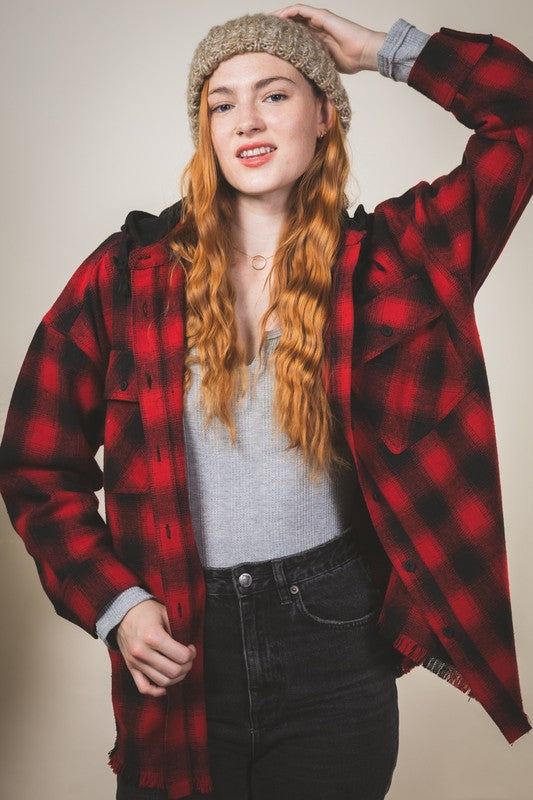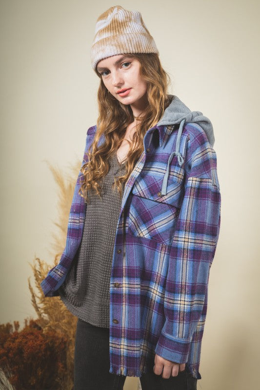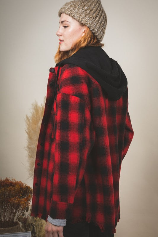 Gorgeous oversized flannel shirt with a hood and a raw hem