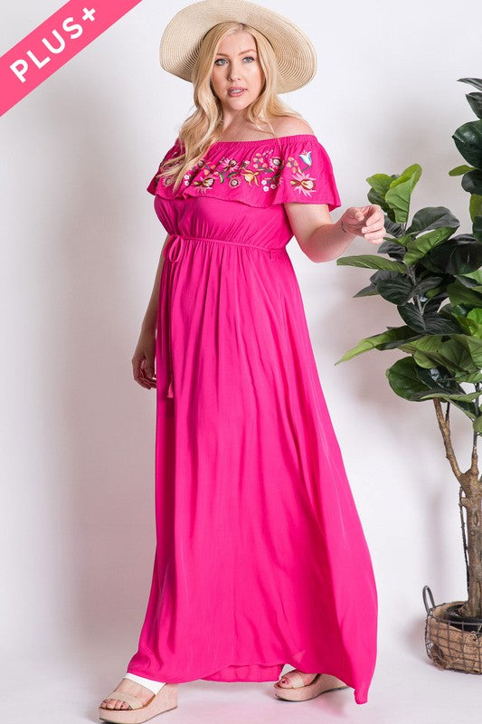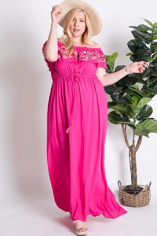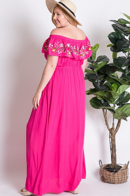 Fuchsia embroidered floral ruffle overlay maxi dress by Addictive Apparel is a plus size dress. It’s so beautiful and perfect for these hot summer days.