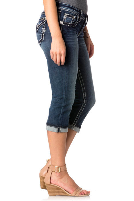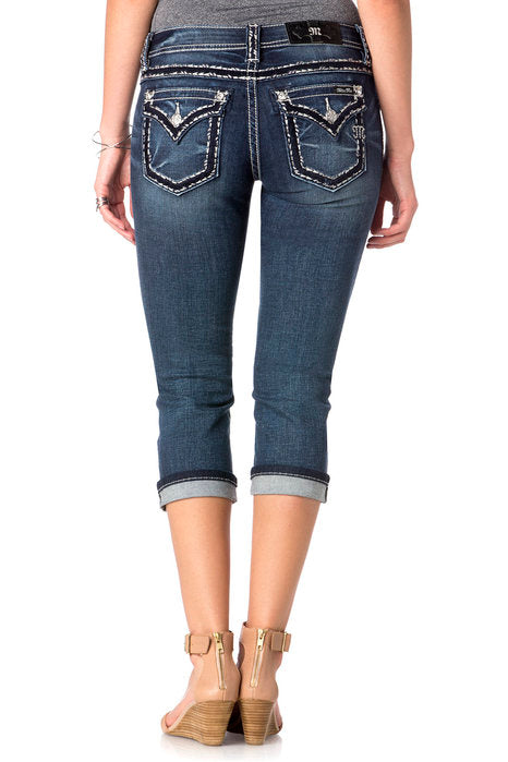 Get back to basics in a pair of Miss Me dark wash cuffed capri’s detailed with fading, whiskering, and logo hardware.