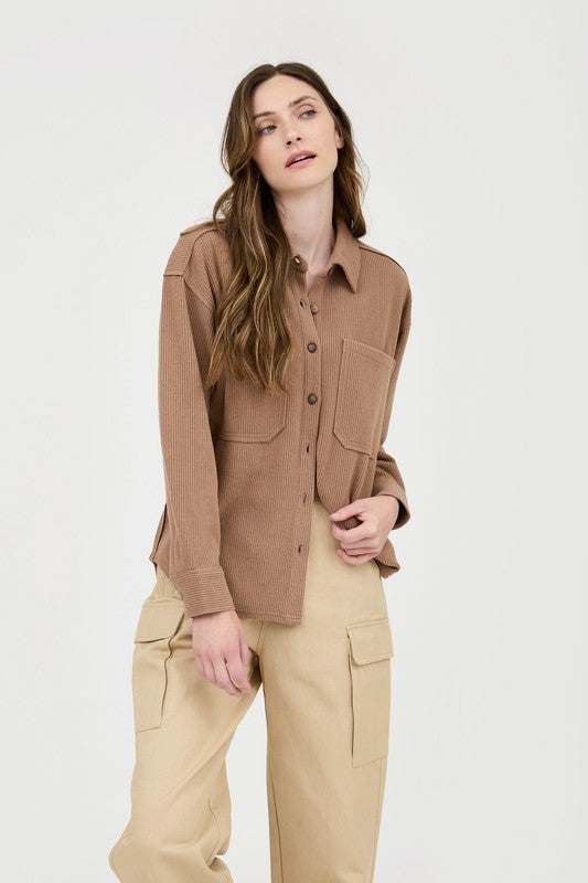 COLLARED BUTTON DOWN LONG SLEEVE BUTTONED CUFF EXPOSED SEAM U HEM BACK YOKE DETAIL RIB KNIT TOP 97%POLYESTER, 3%SPANDEX