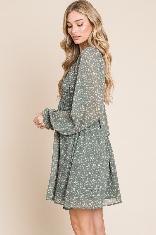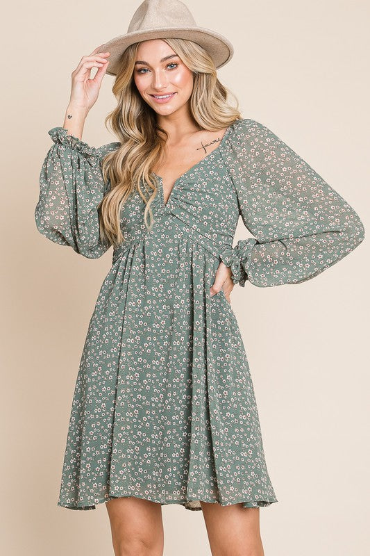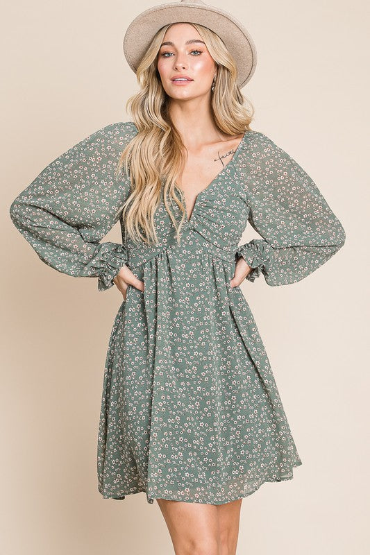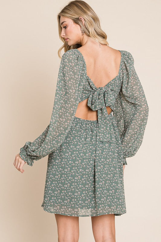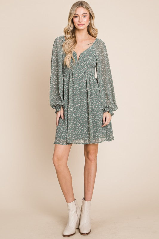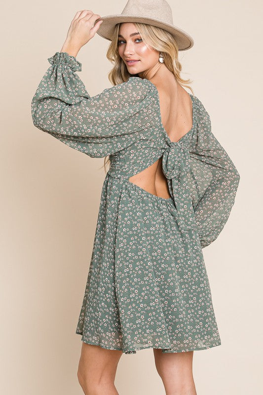 Dusty Sage ditsy floral chiffon split neck open back dress