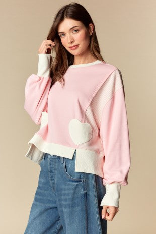 - Relaxed fit - Ribbed crew neckline and hem - Striped contrast panels at shoulder and sleeve - Wide ribbed sleeve cuffs - Heart-shaped front patch pockets - Side slits at hem - Soft and cozy knit fabric