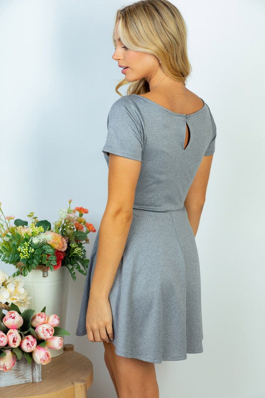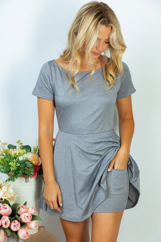 Beautiful short sleeve solid knit dress with a boat neck featuring