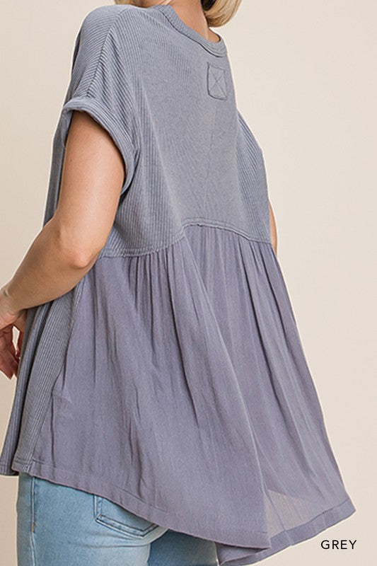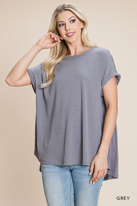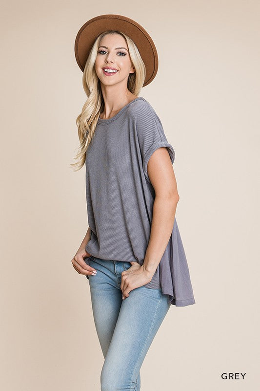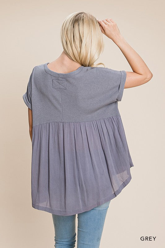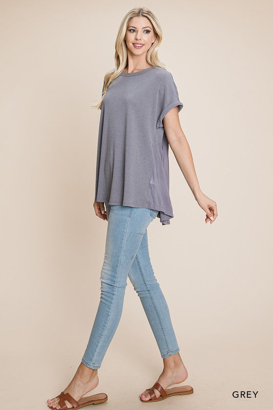 Grey ribbed top with rayon gauze contrast back. This top is gorgeous.