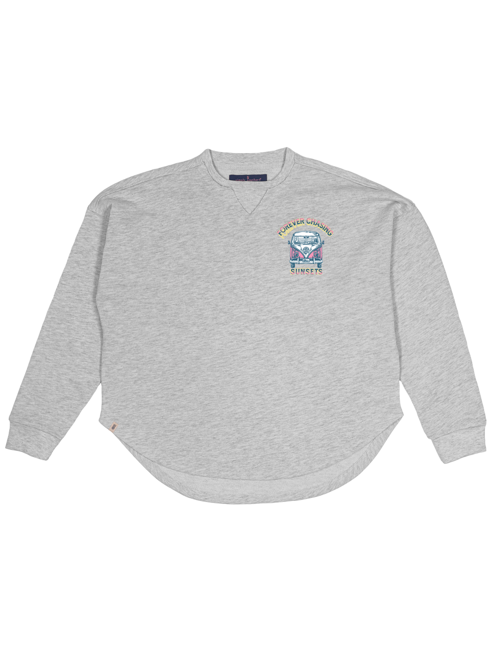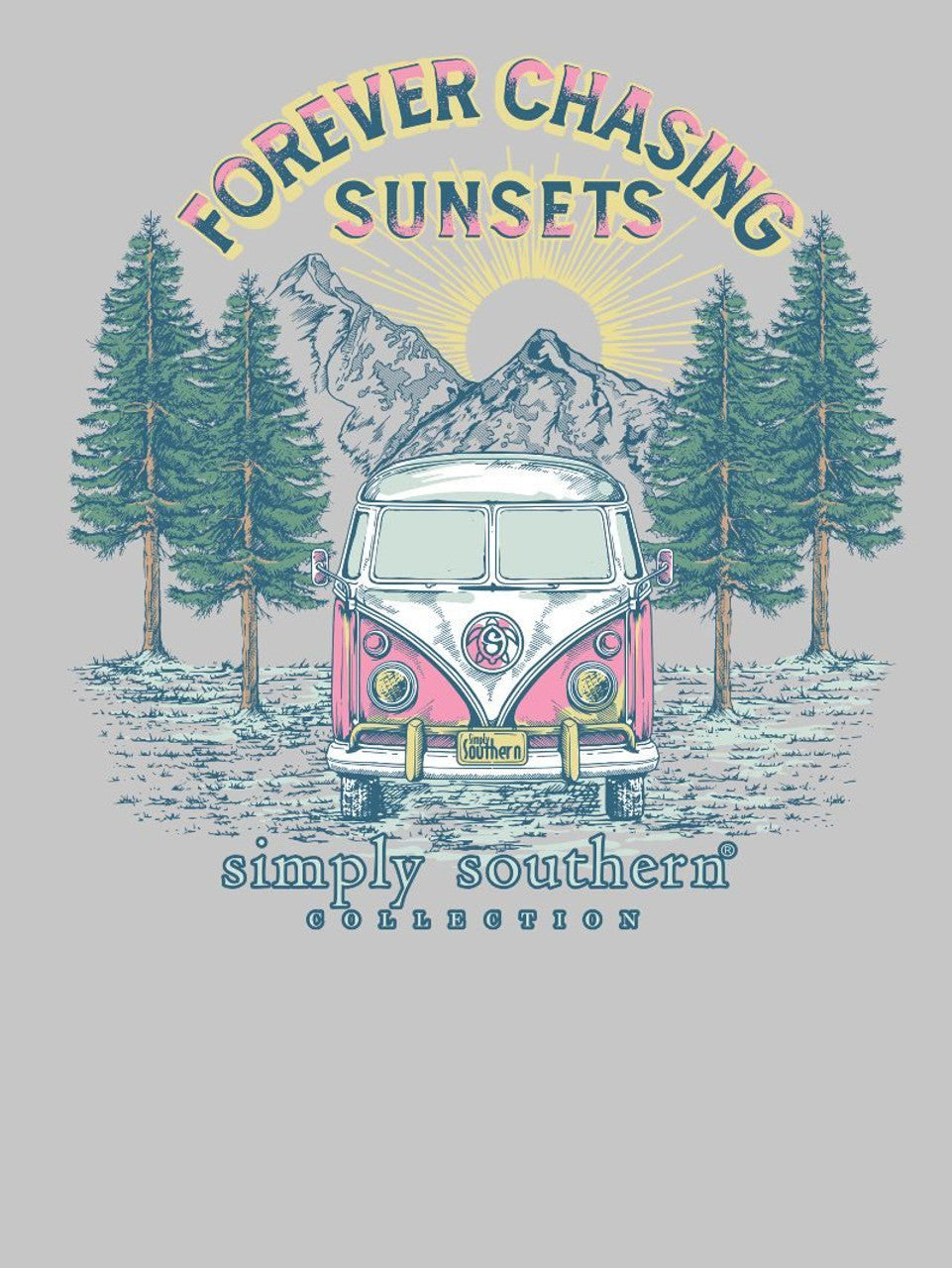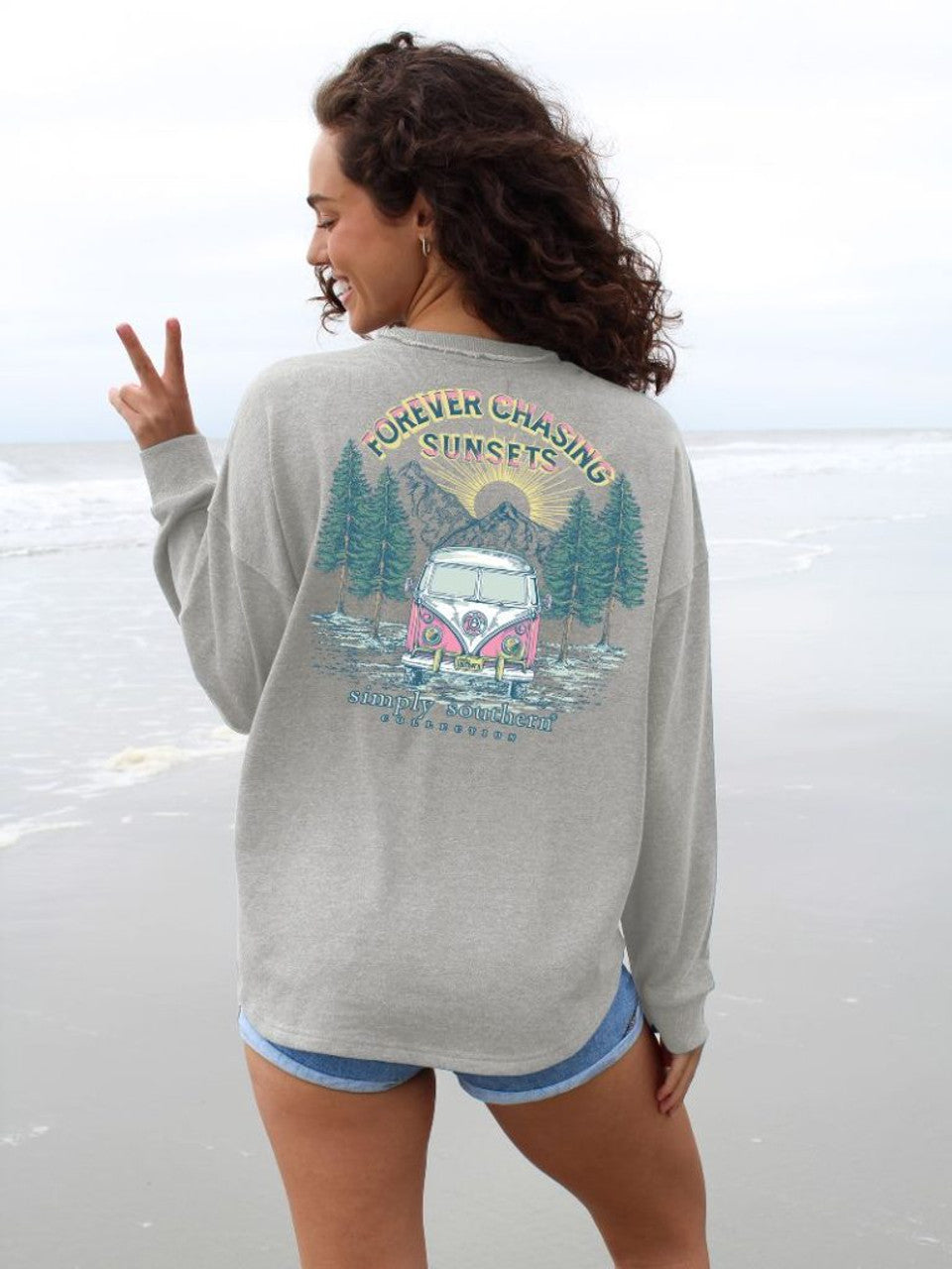 Simply Southern Grey LS pullover with the phrase 'Forever chasing sunsets' and a van driving through the mountain wilderness.
