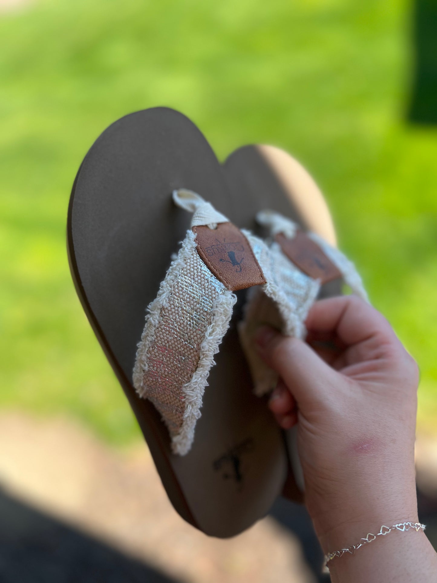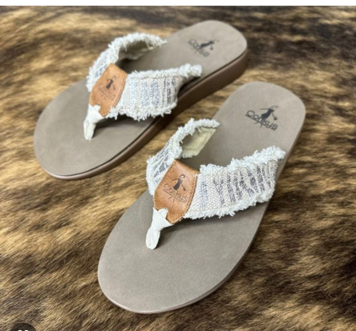 Corkys skinny dip silver zebra comfy flip flops. True to size if you wear a half size we recommend sizing up so if you wear a 7.5 we suggest buying a 8