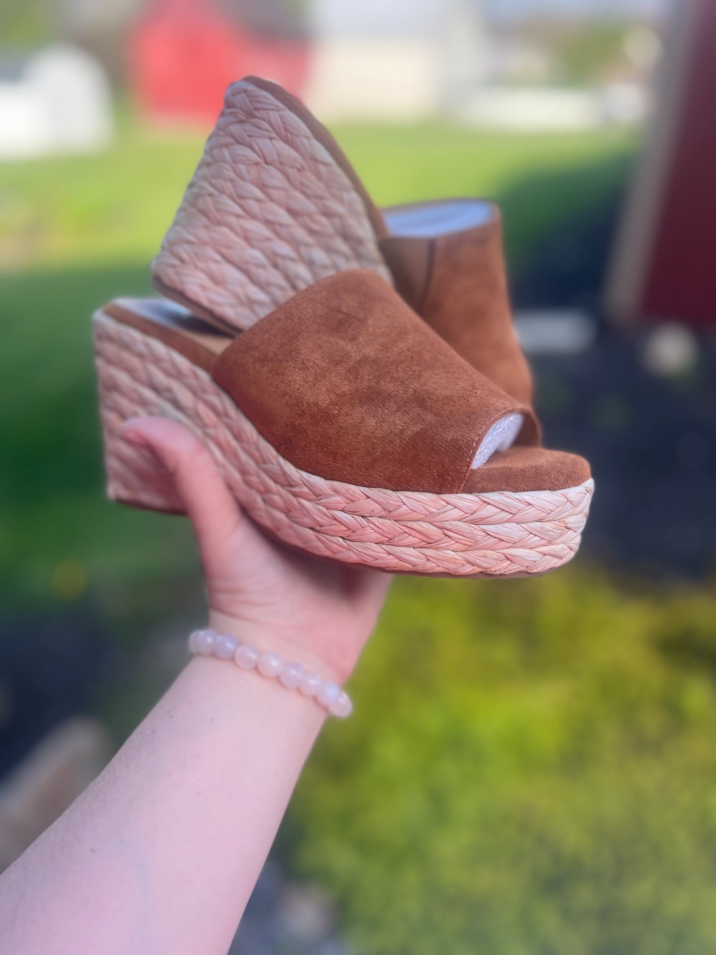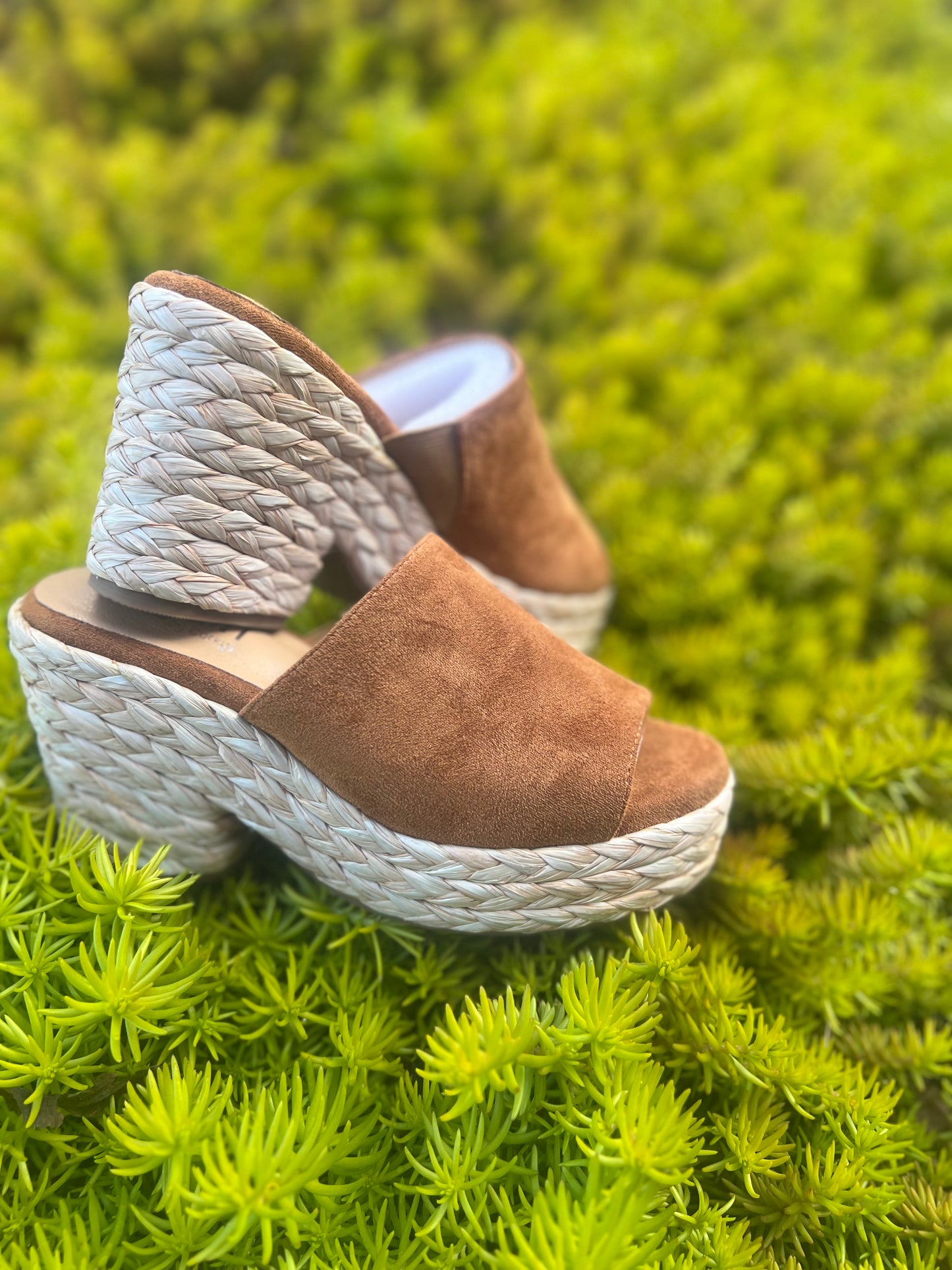 - Braided wrapped sole with faux leather single wide strap slip on sandal