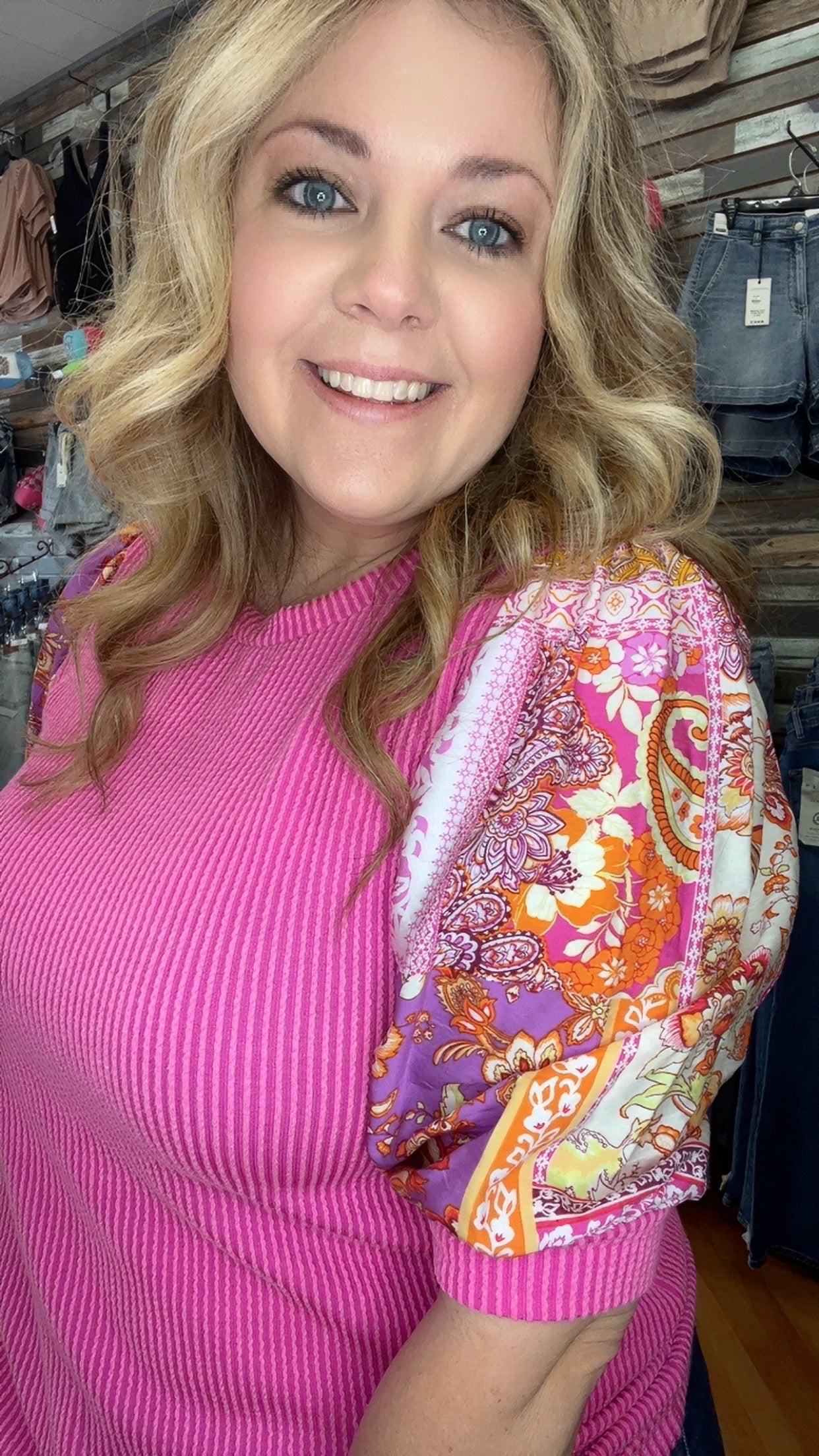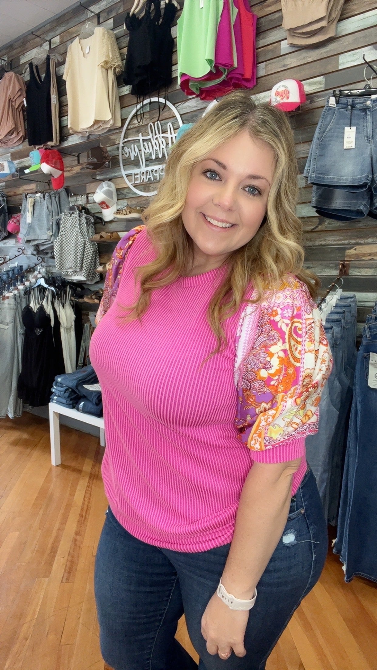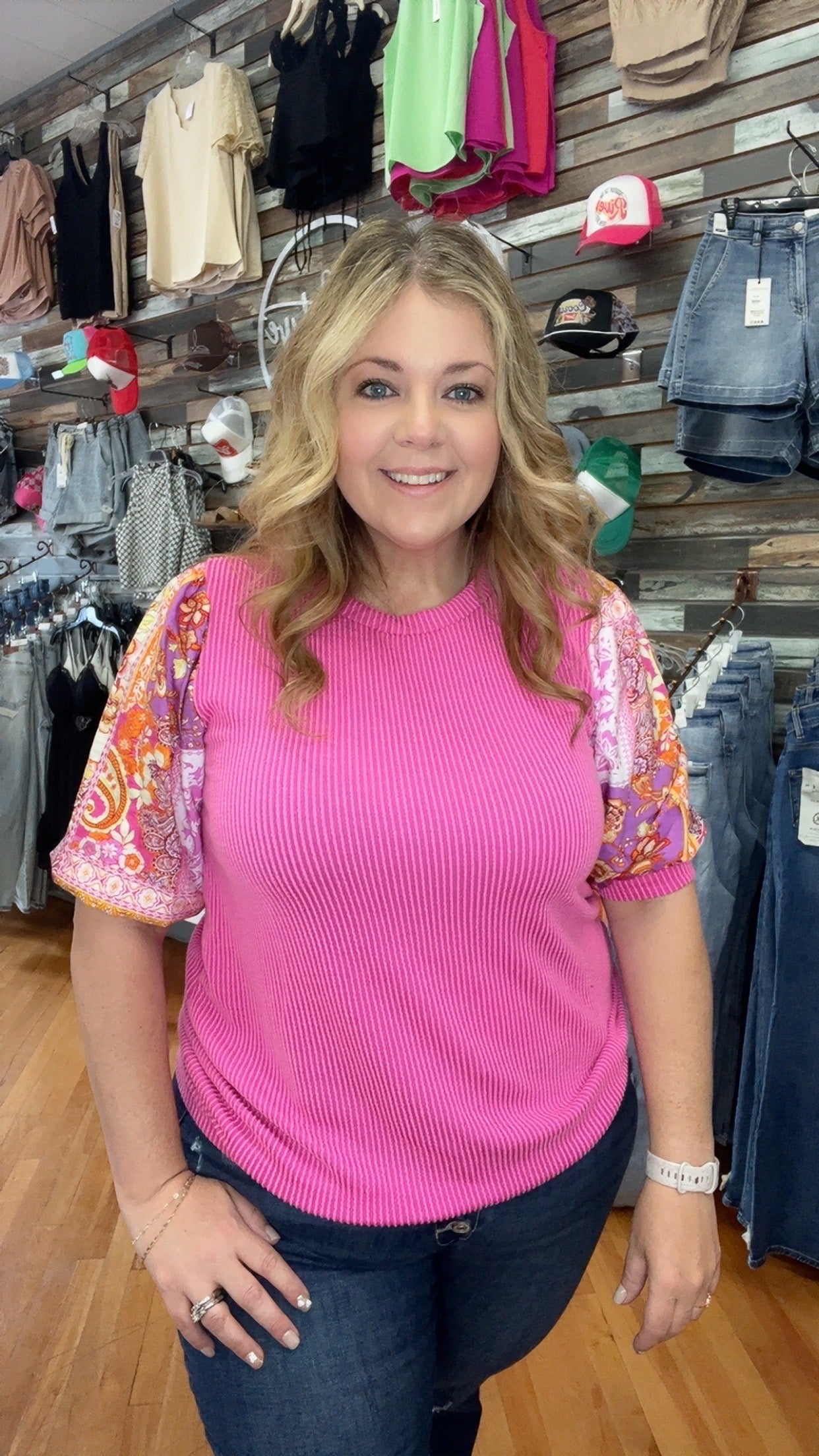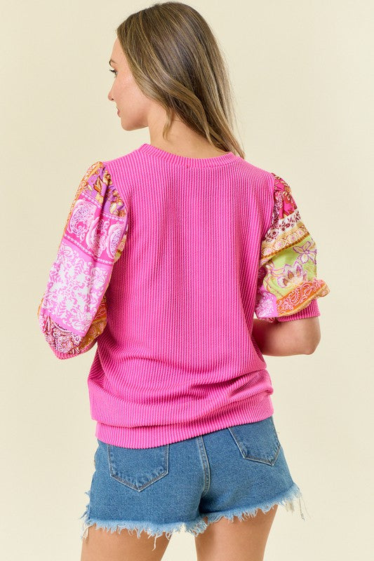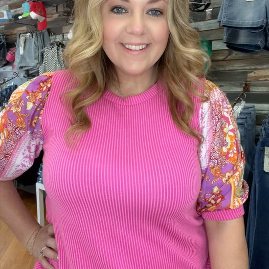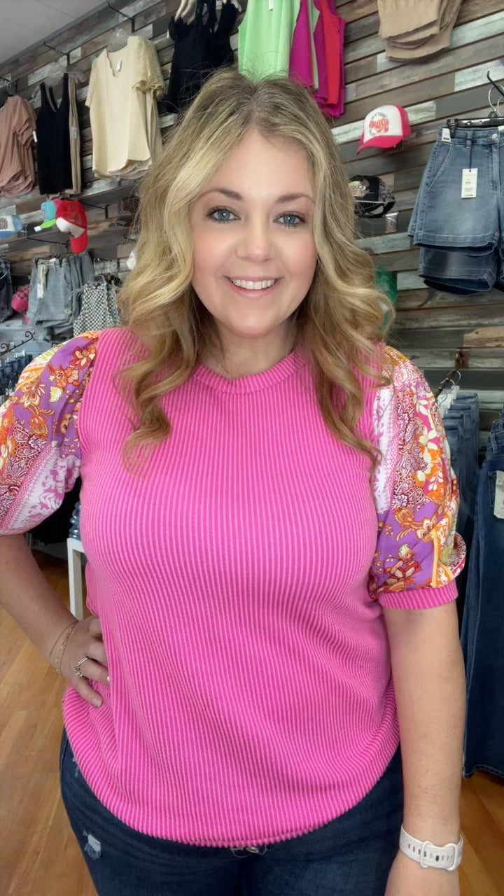 Sophies knit top is made of a rib material. Features a contrast floral print short sleeves. Ragland body, round neckline. Model/Picture information Height: 5'8 US Size: 2 Bust: 33" Waist: 25" ** Model wears a size small**