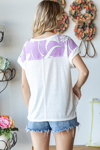 A SOLID COTTON BLEND TOP FEATURNG A FLORAL PRINT CONTRAST, DROP SHOULDER,