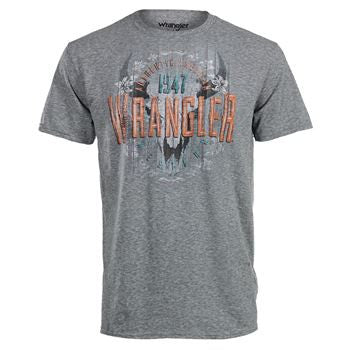 This Men's Wrangler FlagT-Shirt is made of an ultra-soft cotton/polyester blend to keep you cool all day with a ribbed collar for complete comfort. It features a steer skull graphic print designs . Whether you’re working on the farm, riding or lounging around this shirt will have you looking and feeling great.
