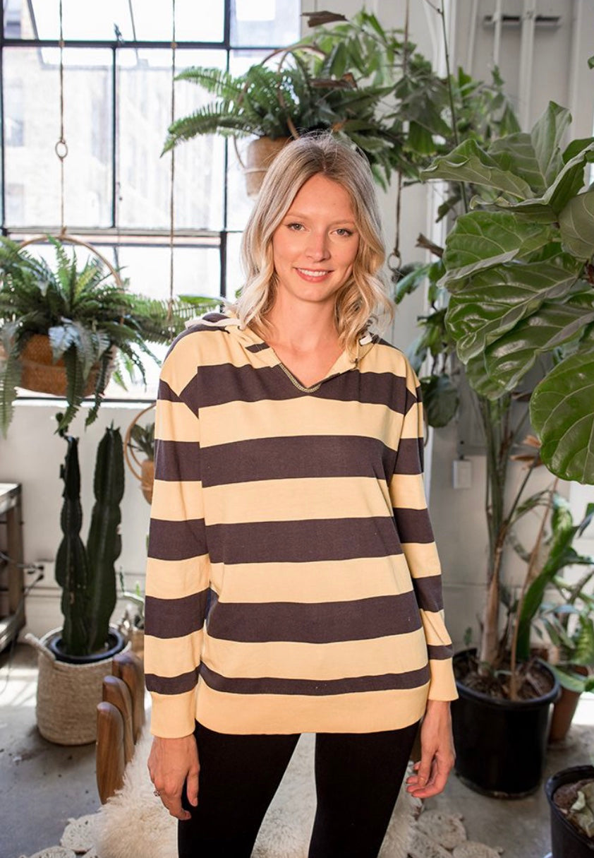 Sew In Love mustard and navy striped hoodie with lace criss cross back detail.