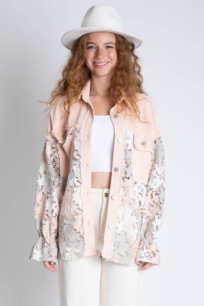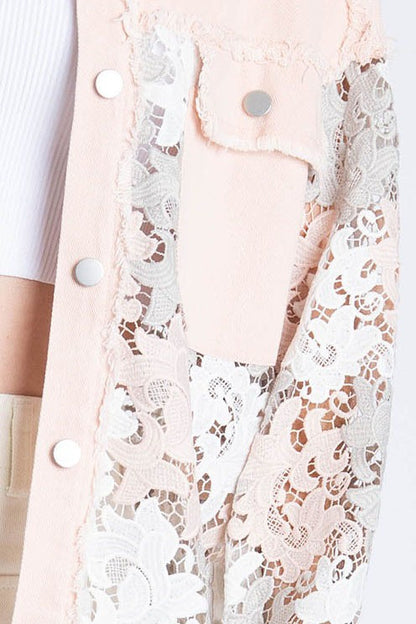 Peach Multi Denim Jacket with a ragged flower lace detail and raw hem.