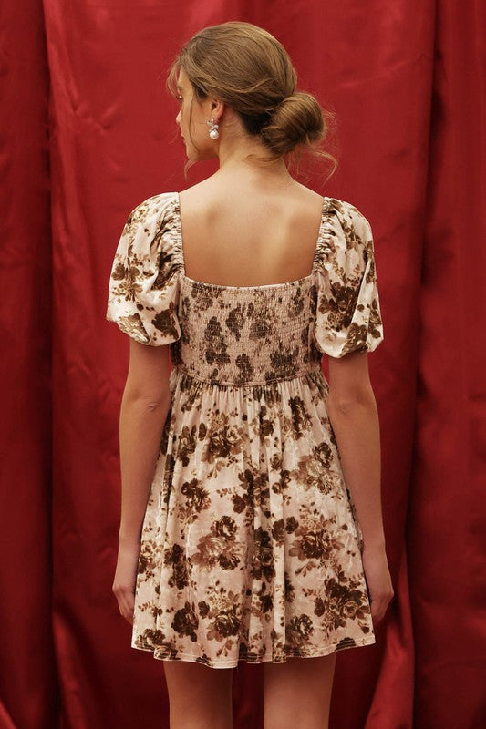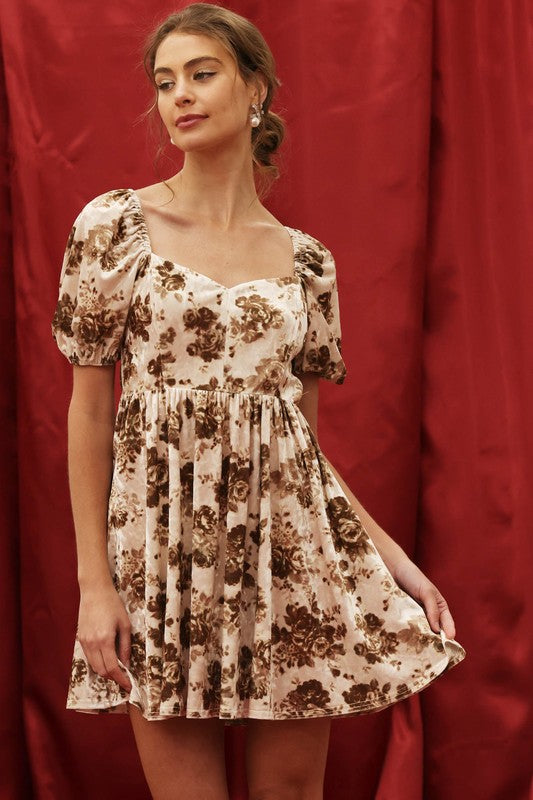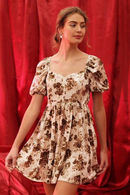 SWEETHEART NECK SHORT PUFF SLEEVE HIGH WAIST MINI DRESS VELVET FLORAL LINED HOLIDAY SHELL: 100% POLYESTER LINING : 100% POLYESTER