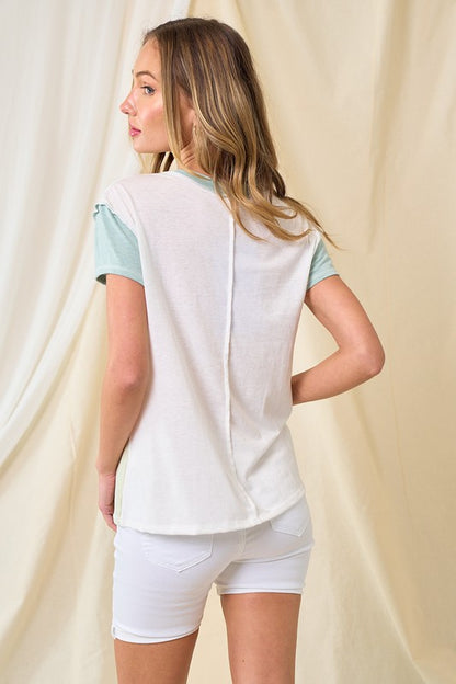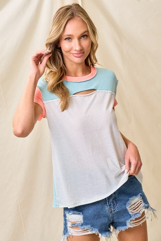 This short sleeves color block top is made of a cotton triblend material. Features a color block theme, has a open detail in front. Model/Picture information Height: 5'8 US Size: 2 Bust: 33" Waist: 25" * Model wears a size small*