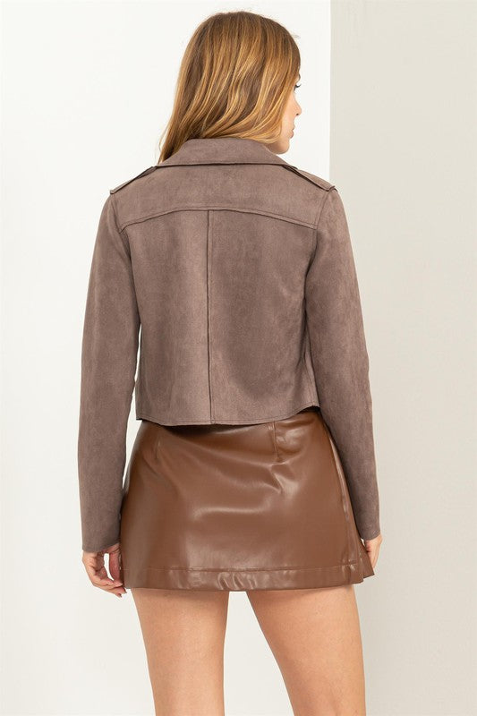 THIS JACKET FEATURES A COLLAR WITH NOTCHED LAPELS AND LONG SLEEVES.