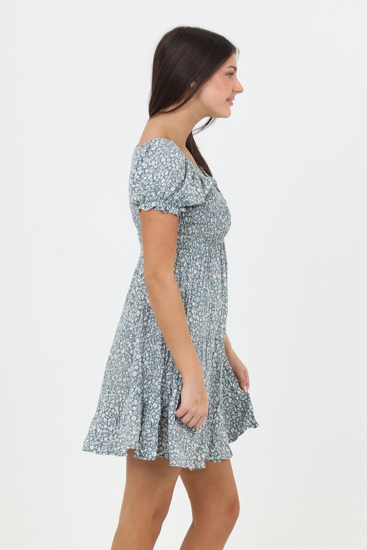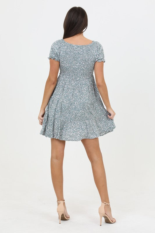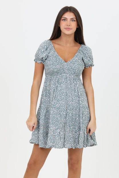V NECK PUFF SLEEVE SMOCKED BODICE DRESS