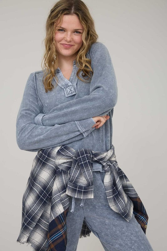 V NECKLINE LONG SLEEVES RAGLAN PATCHWORK DETAIL EXPOSED SEAM RAW EDGE DETAIL RELAXED FIT NOT LINED KNIT TOP 60% COTTON 40% POLYESTER