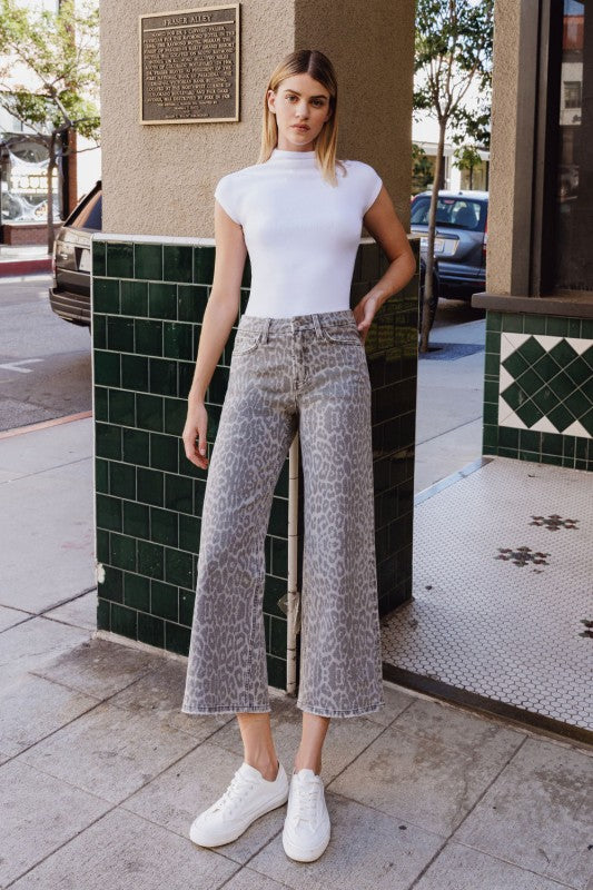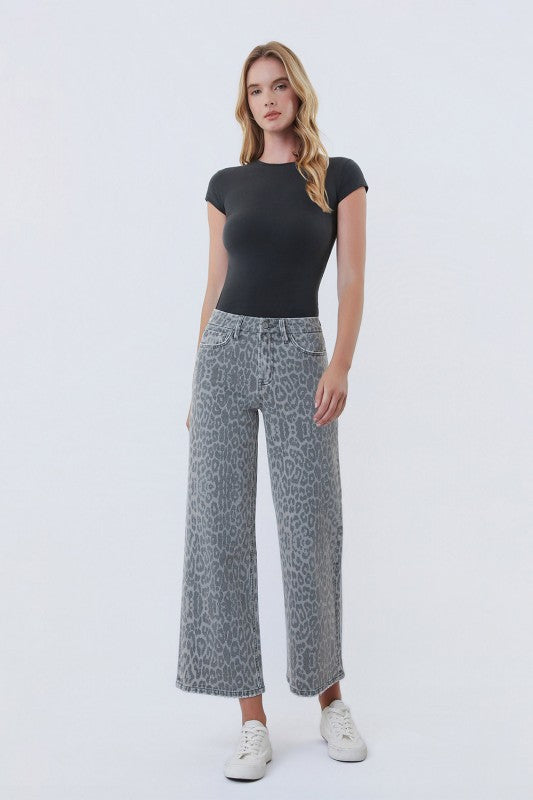 HIGH RISE GREY LEOPARD PRINT CROP WIDE LEG JEANS Vervet COMFORT STRETCH DENIM, HIGH RISE WAIST, 5 POCKETS, FINISHED HEM,