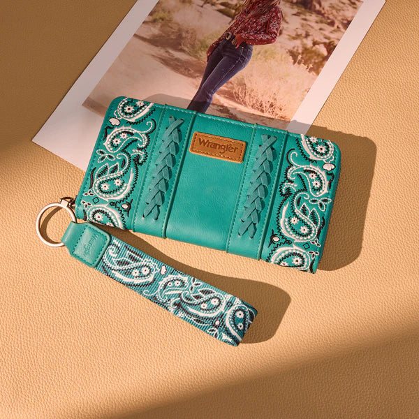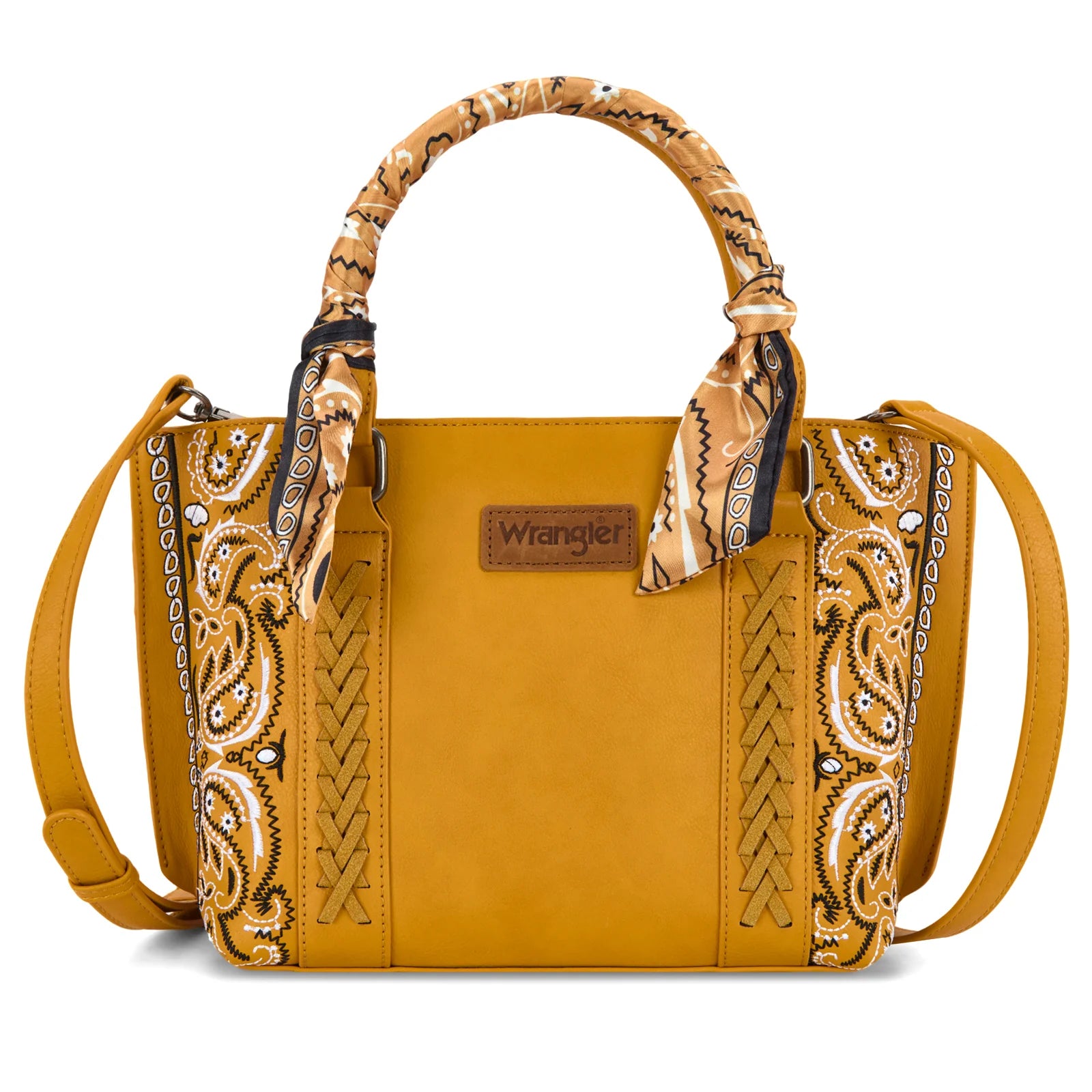 Made of durable PU leather, this collection features a bandana-print wrapped top handle that adds a relaxed, rustic boho charm.